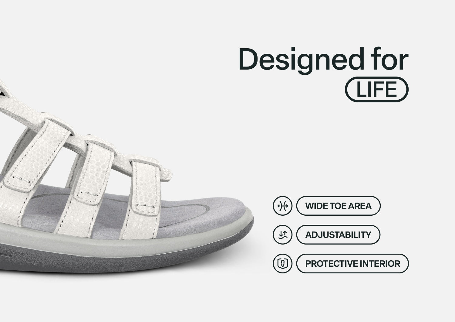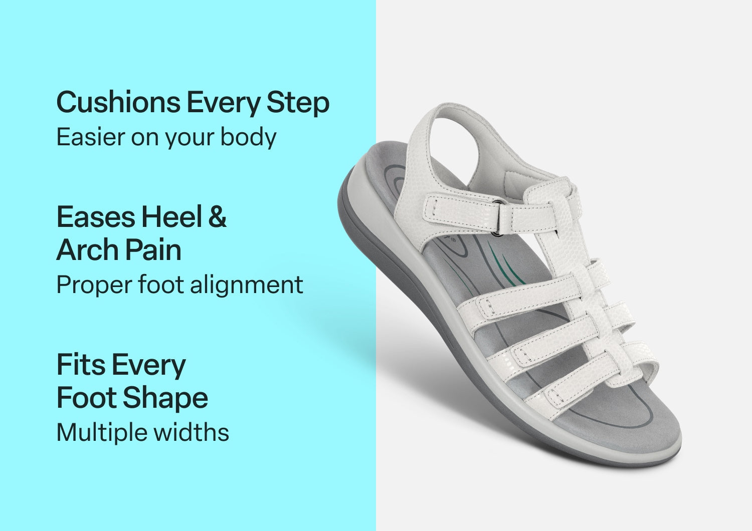 Feel invincible in our surefooted gladiator sandal and enjoy bioengineered walking comfort wherever you roam. Adjust the five padded leather straps for a fully custom fit that places the center strap comfortably atop your foot. Our ingenious inset strap can be adjusted and opened from both sides, so getting into these easy, even when bending over is difficult.