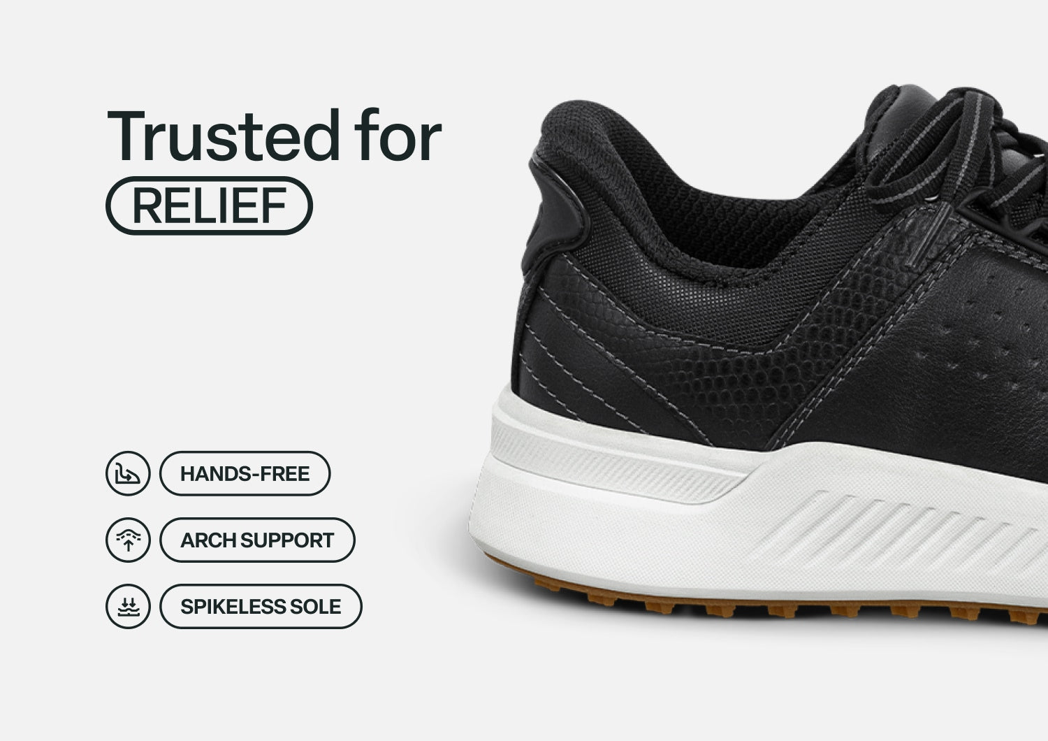 Step onto the course with confidence and luxurious comfort that lasts from the first tee to the final putt. Approach Shot combines elegant leather styling with our innovative patented hands-free technology, so you can slip on and focus entirely on perfecting your game. The premium water-repellent leather upper protects against morning dew while delivering a sophisticated, course-ready look. Experience the difference that professional-level comfort makes with our Ortho-Cushion™ System support and specialized spikeless tread for superior stability on every terrain.