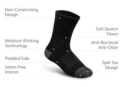 Orthofeet Bunion Relief socks are uniquely designed with Split-Toe construction. The stitched seam separates the big toe from the rest of the digits to promote natural alignment, relieve pressure and prevent friction & toe overlap.