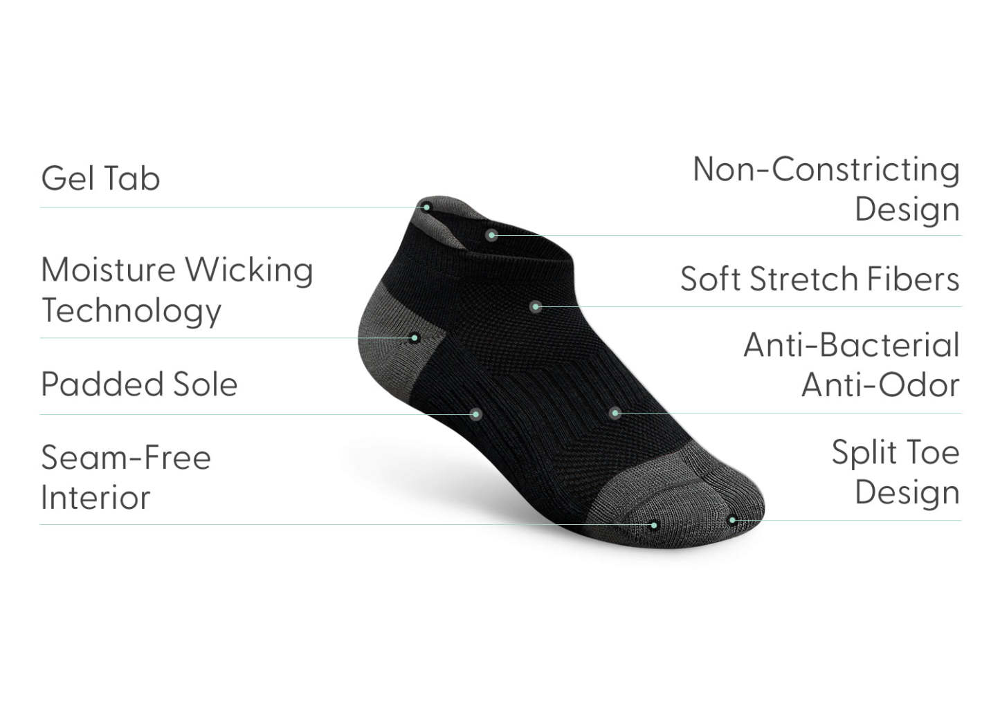 Orthofeet Bunion Relief socks are uniquely designed with Split-Toe construction. The stitched seam separates the big toe from the rest of the digits to promote natural alignment, relieve pressure and prevent friction & toe overlap.
