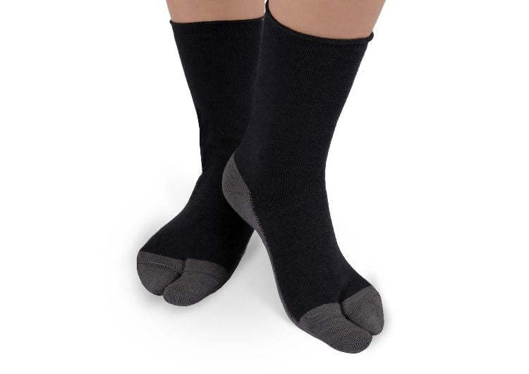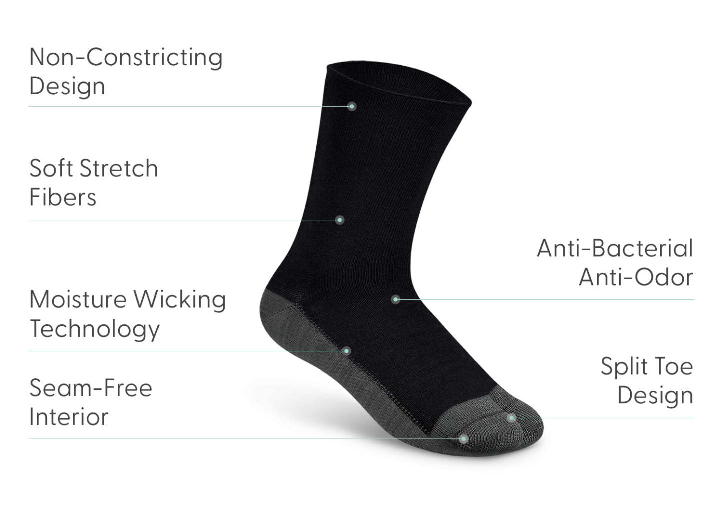 Orthofeet Bunion Relief socks are uniquely designed with Split-Toe construction. The stitched seam separates the big toe from the rest of the digits to promote natural alignment, relieve pressure and prevent friction & toe overlap.
