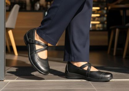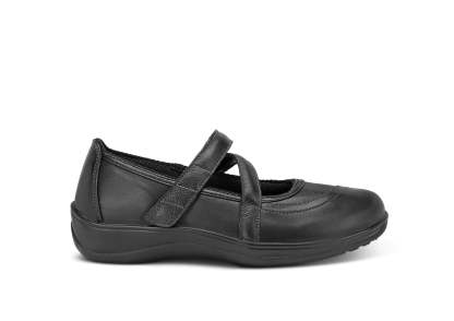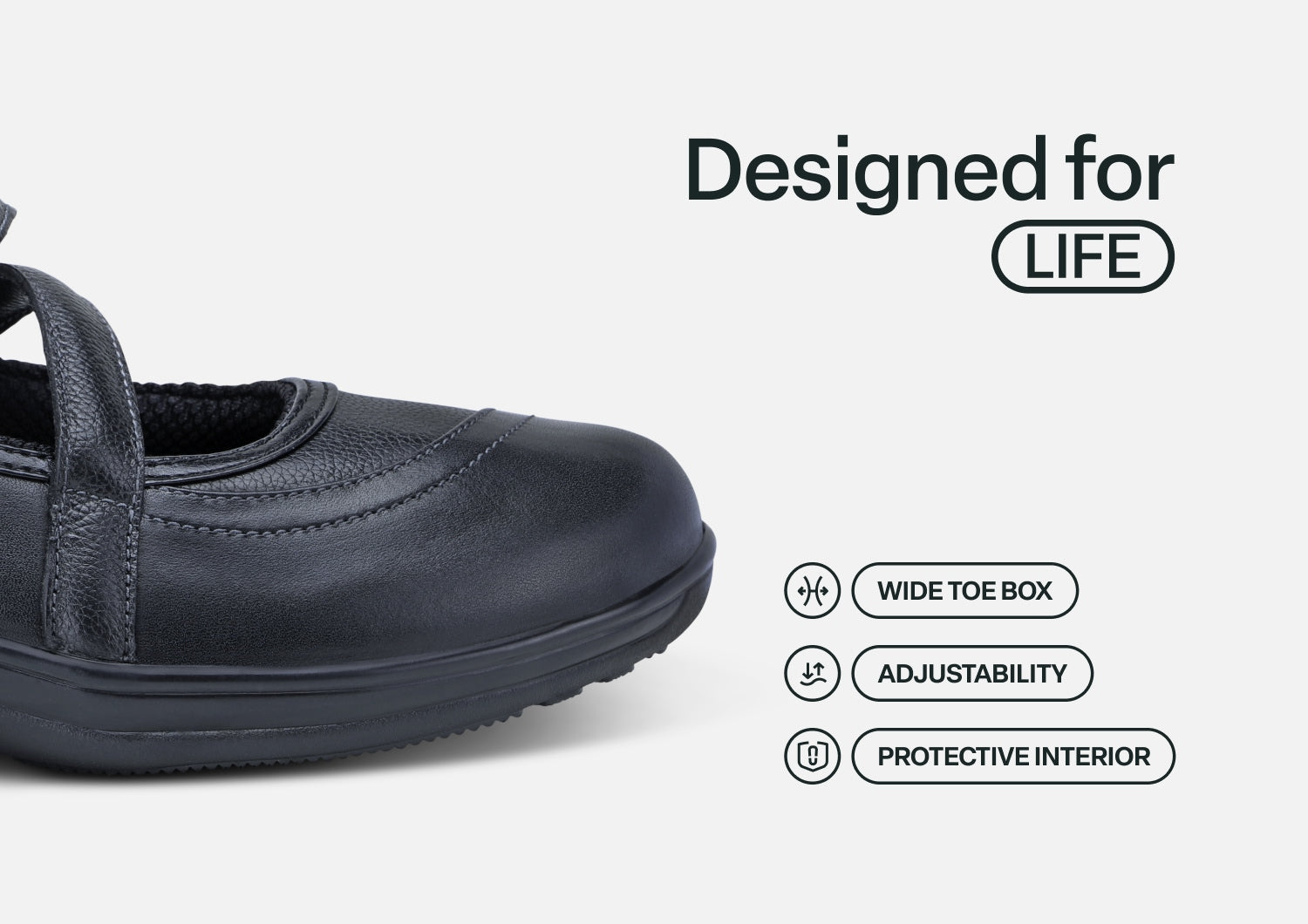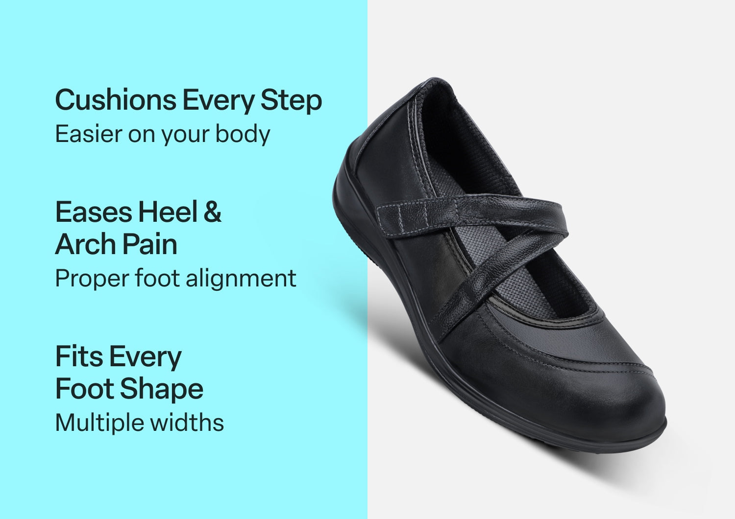 Pull open the widely adjustable strap on this lightweight, soft leather Mary Jane and slide into therapeutic comfort that protects feet from pressure and irritation. Look great all day and enjoy longer walks without pain, thanks to advanced orthotic support, a roomy fit (and 4 width sizes) and the impact-dispersing ergonomics of the Ortho-Cushion™ System to keep every step stable.