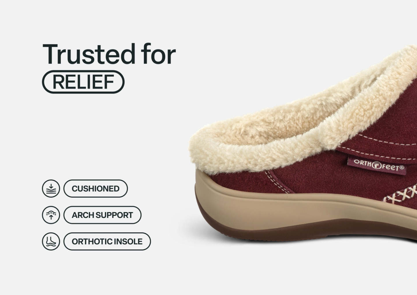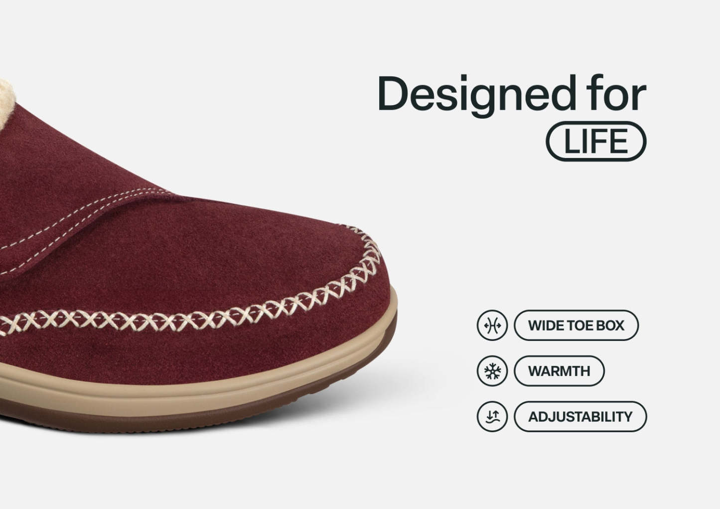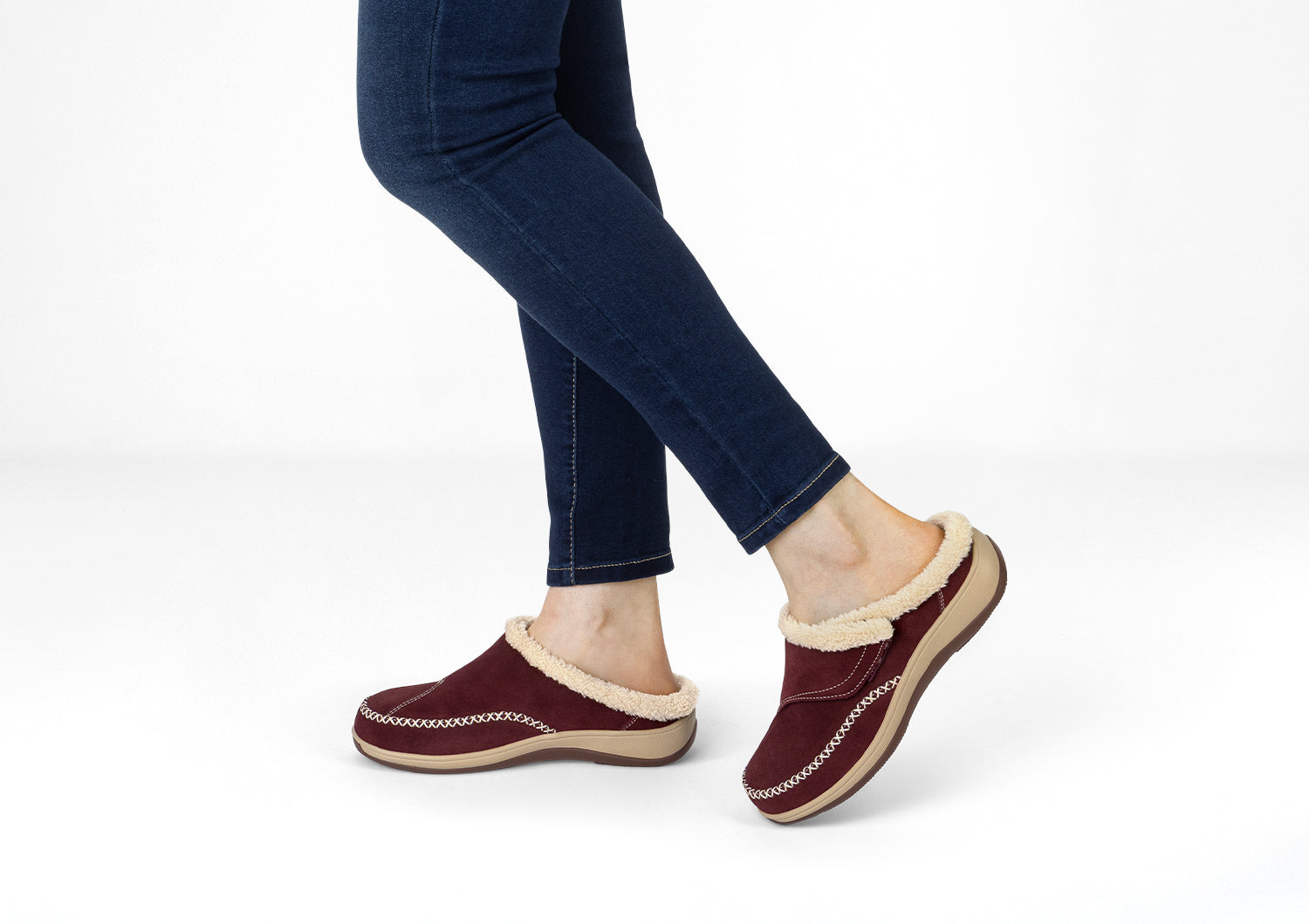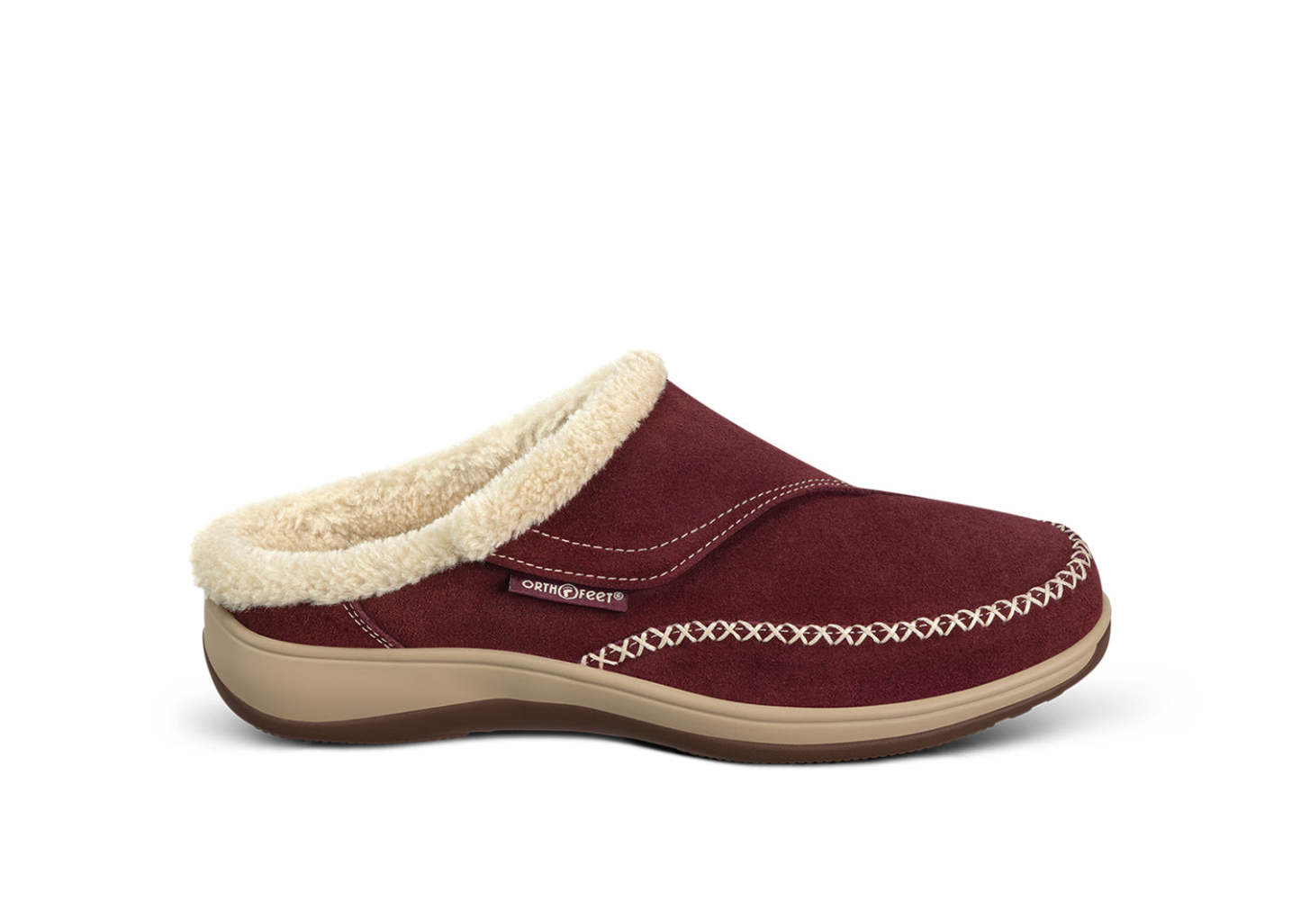 The adjustable side strap on this suede slip-on slipper opens wide to welcome feet into faux fur-lined luxury, with a heel lip that helps keep them on. Under the cozy warmth is full-foot cushioning and pain-relieving support of the Ortho-Cushion™ System. Charlotte's roomy toe box keeps the pressure off sensitive conditions and allows feet to move freely, all around the house.