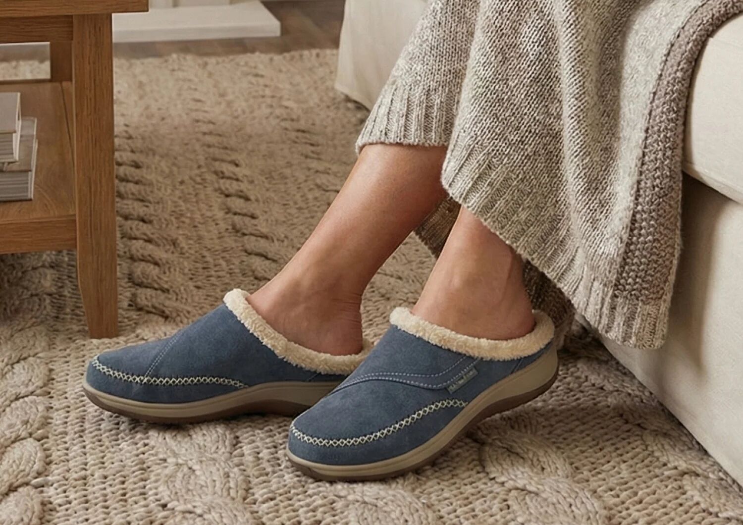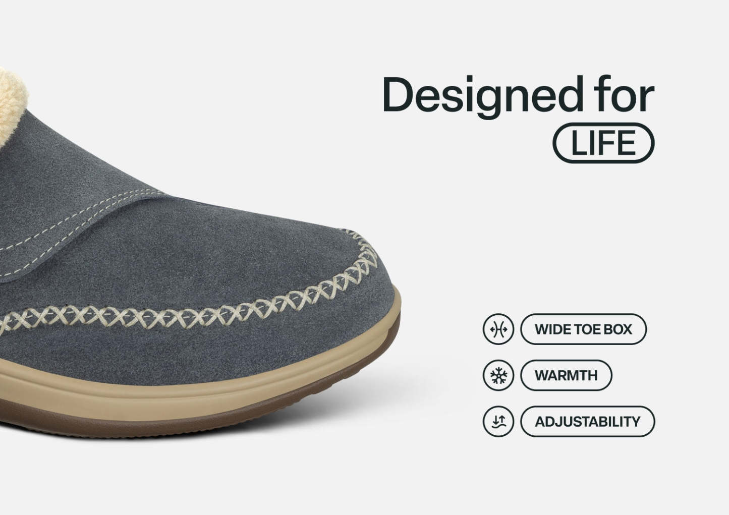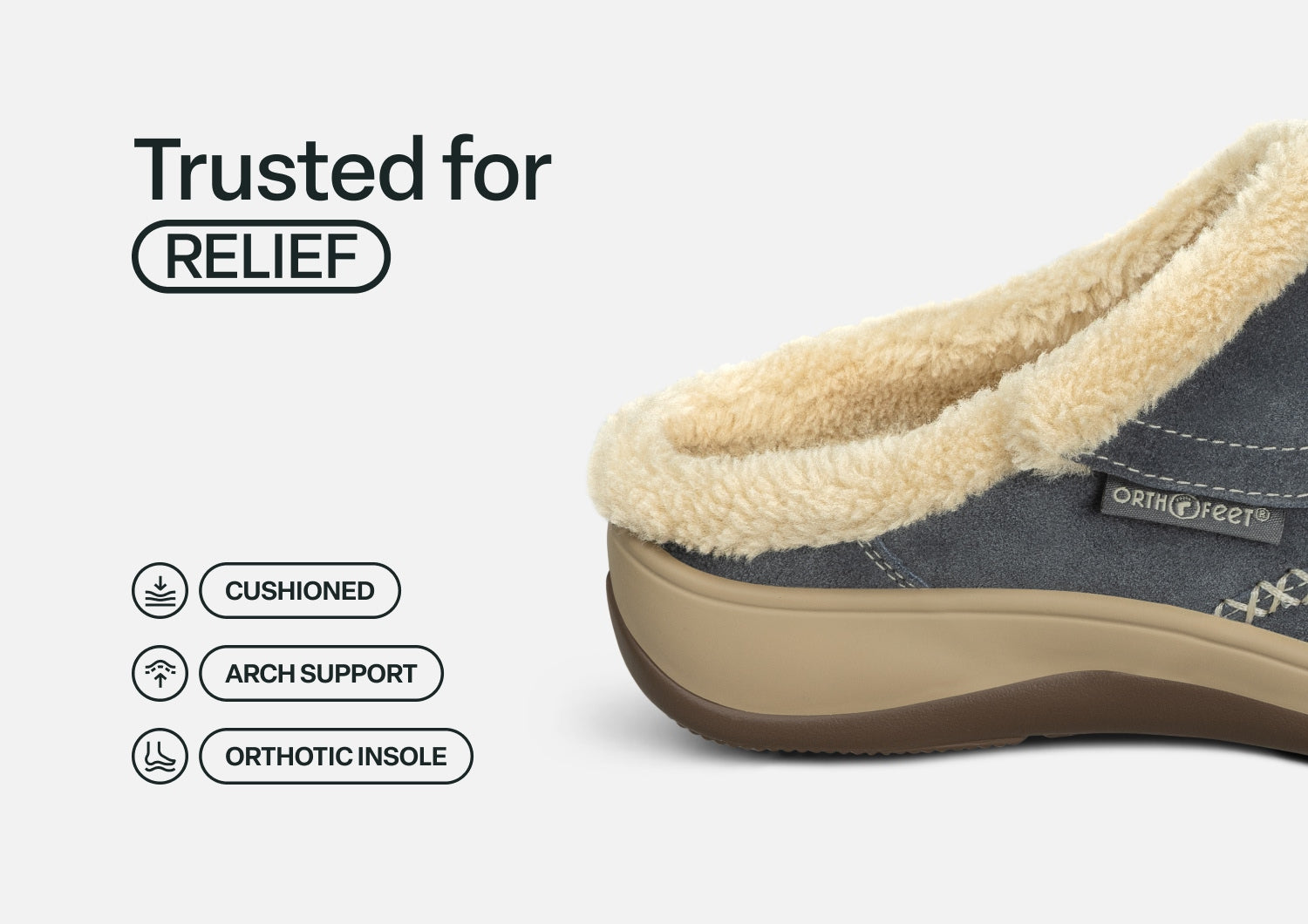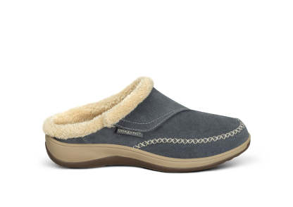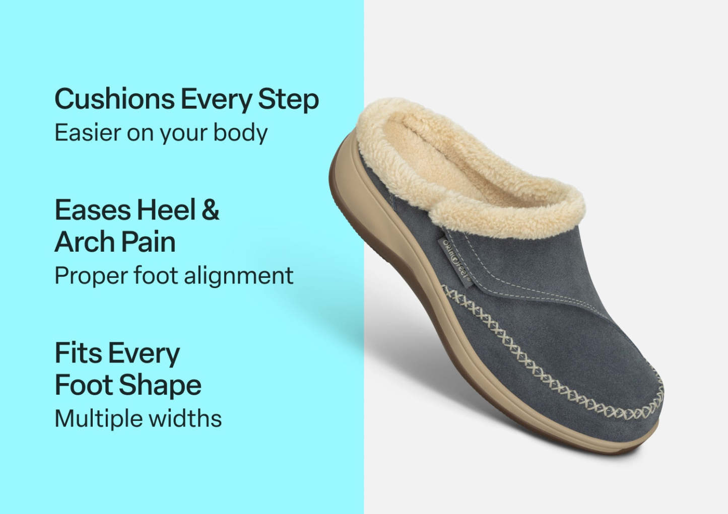 The adjustable side strap on this suede slip-on slipper opens wide to welcome feet into faux fur-lined luxury, with a heel lip that helps keep them on. Under the cozy warmth is full-foot cushioning and pain-relieving support of the Ortho-Cushion™ System. Charlotte's roomy toe box keeps the pressure off sensitive conditions and allows feet to move freely, all around the house.