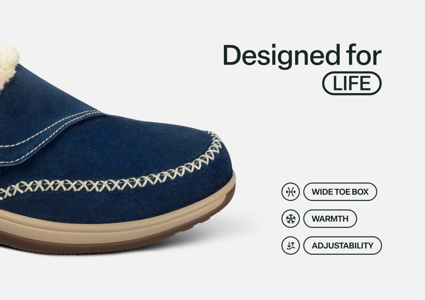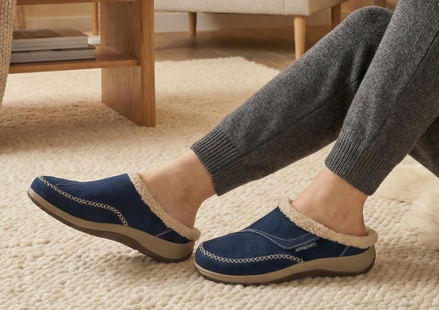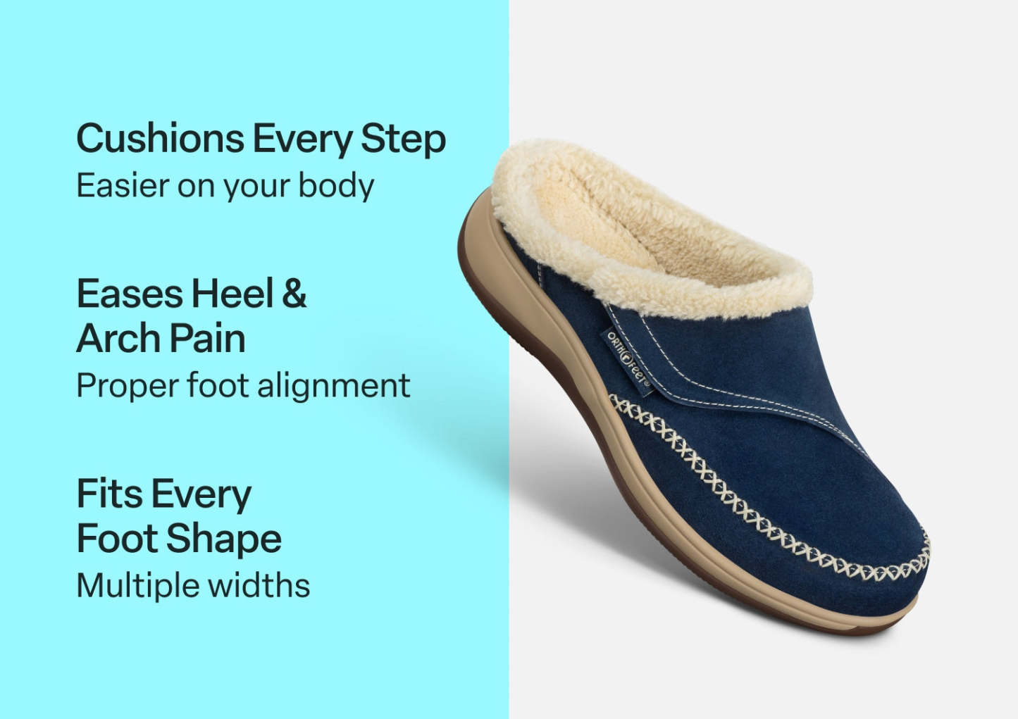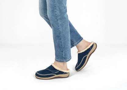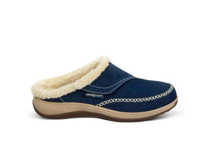 The adjustable side strap on this suede slip-on slipper opens wide to welcome feet into faux fur-lined luxury, with a heel lip that helps keep them on. Under the cozy warmth is full-foot cushioning and pain-relieving support of the Ortho-Cushion™ System. Charlotte's roomy toe box keeps the pressure off sensitive conditions and allows feet to move freely, all around the house.