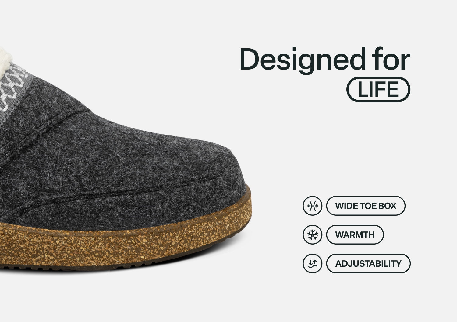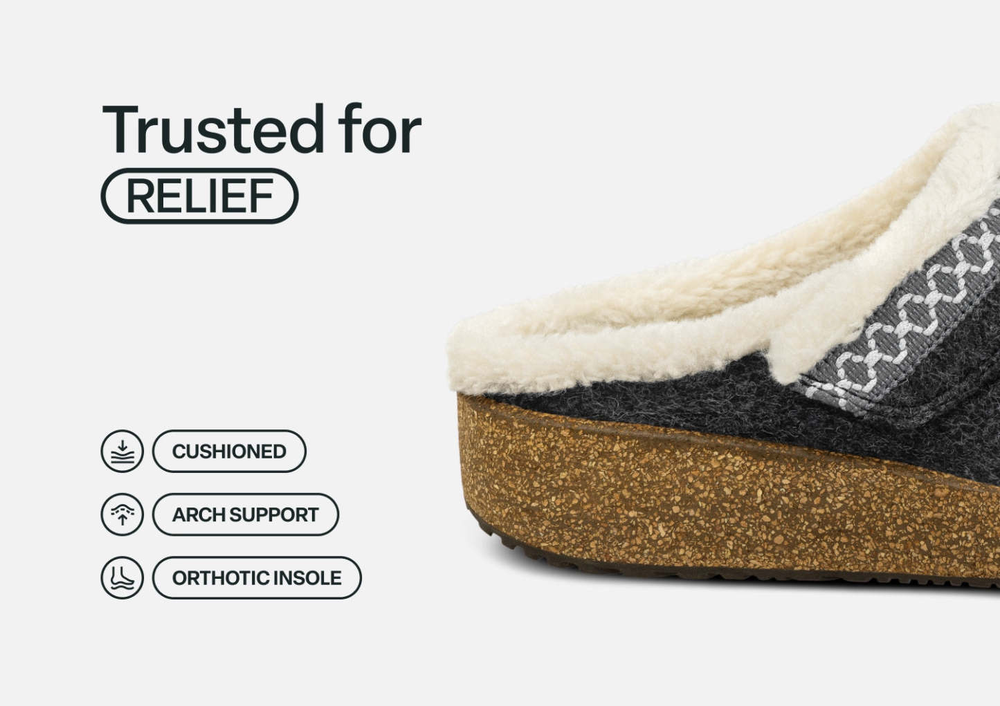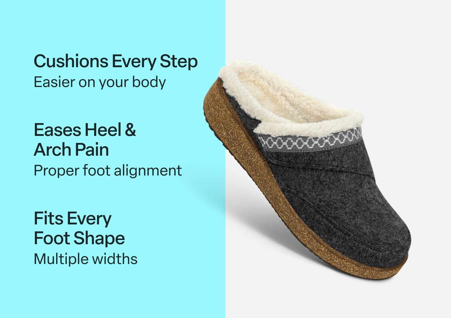 Move easy, with all the comforts of home, even when you venture out. Slip into the faux fur lining (even the insole) for extra cozy protection. And take the pressure out of every step, with Ortho-Cushion™ System support, now in a cork blend wedge slipper! Cozy textile uppers, with adjustable strap, wrap a roomy interior, for a secure fit that pampers sensitive conditions.
