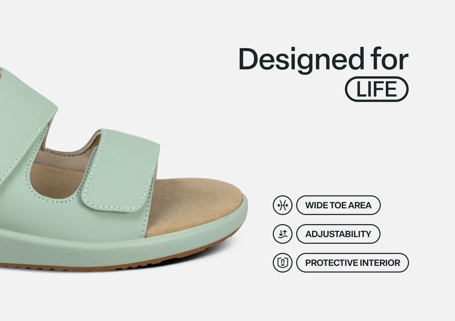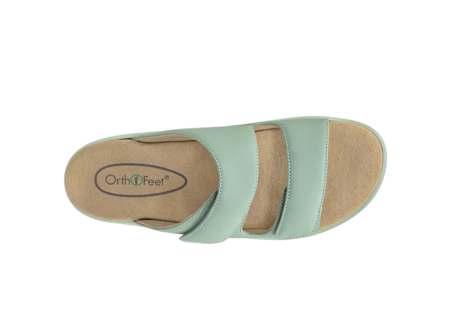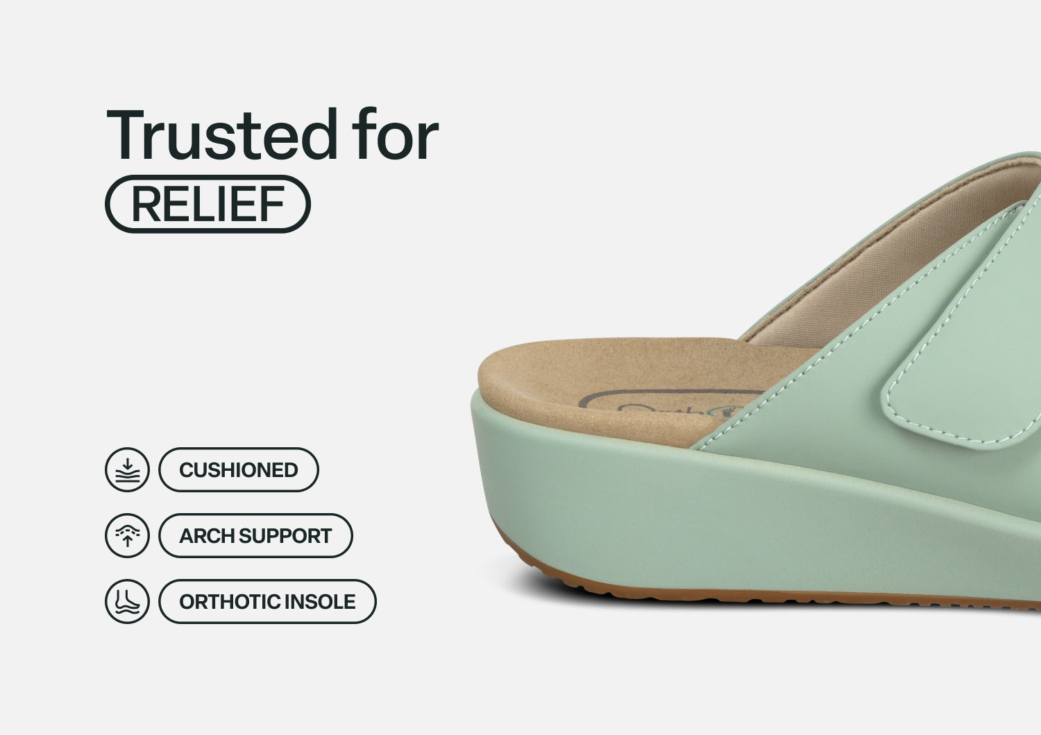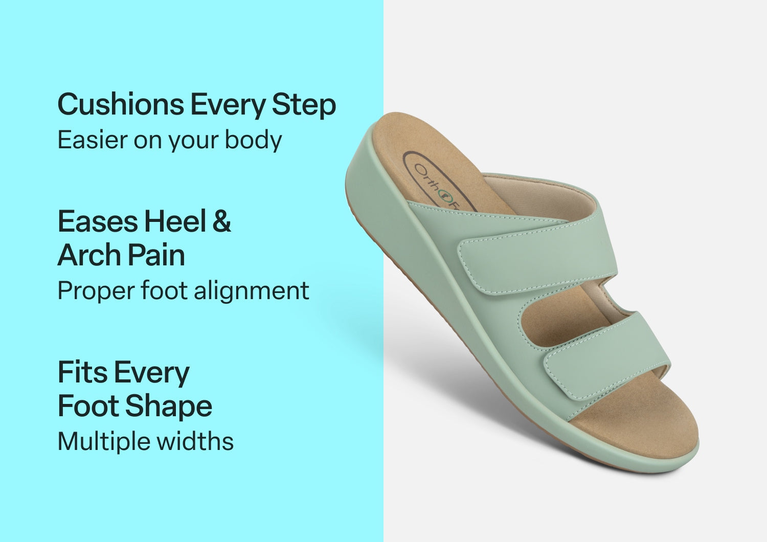 As easy on the eyes as they are on every step you take: this beautiful wedge doesn’t compromise your healthy comfort or body alignment. Soft and padded inside, the two pull straps adjust a perfect fit and can open completely. Enjoy everywhere you go, with advanced Ortho-Cushion™ System support underfoot to offload walking pressure and absorb impact.