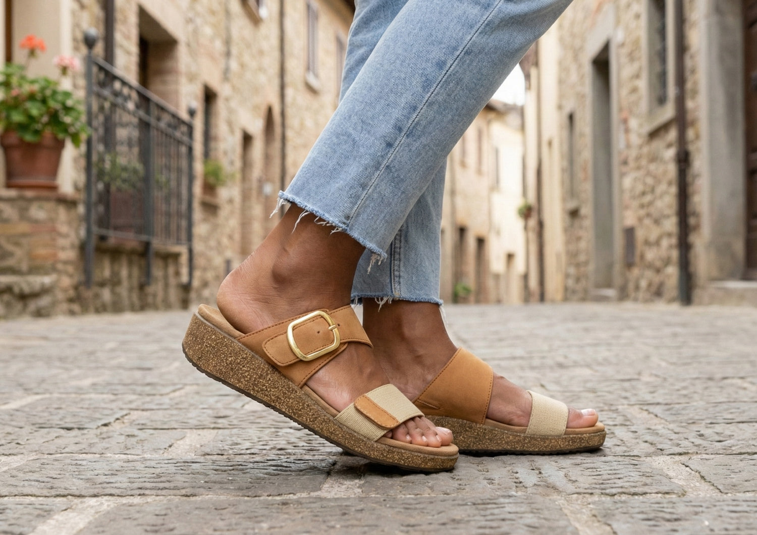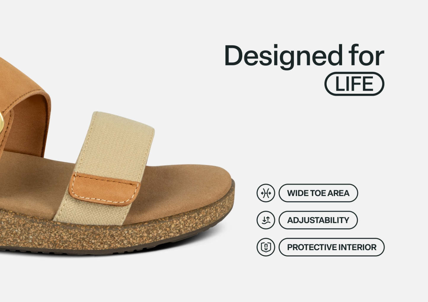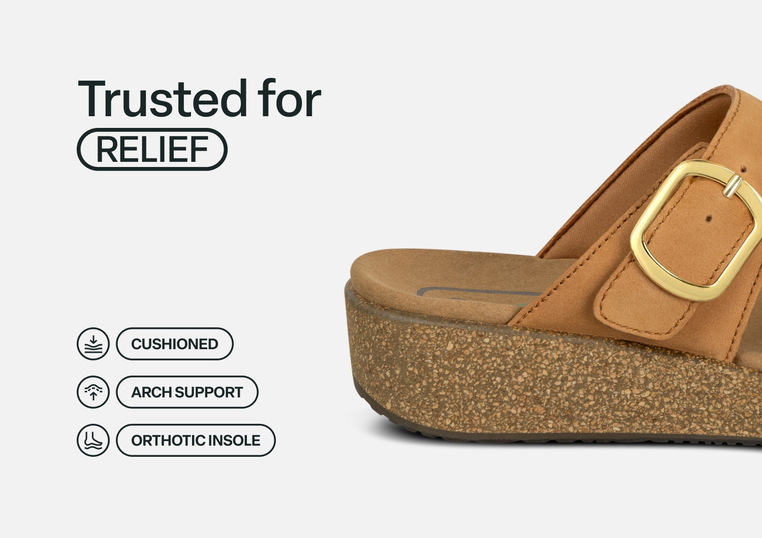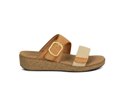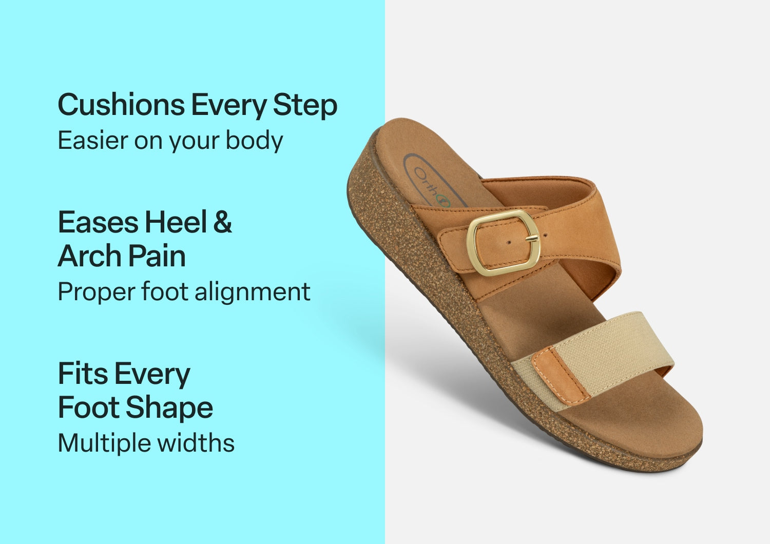 Pretty hip styling meets very healthy comfort, elevated by the natural lightness of our cork wedge design. The fore foot strap of this sandal is canvas, and the inset strap is leather with an adjustable buckle. Both are padded to protect sensitive feet. Walk farther with advanced Ortho-Cushion™ System support, stability and absorption to take pain out of every step.