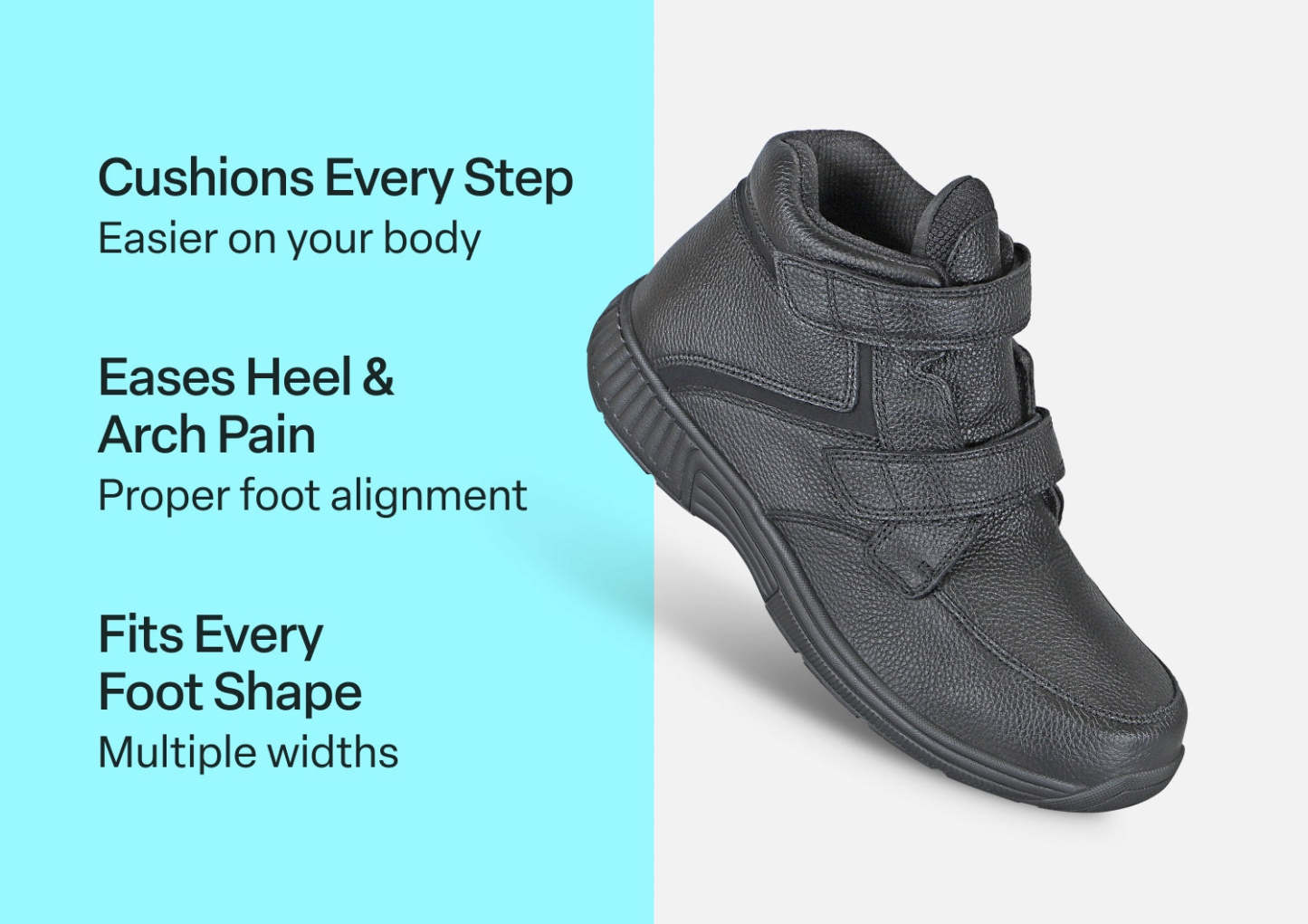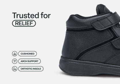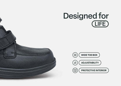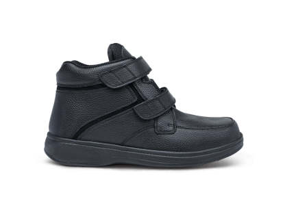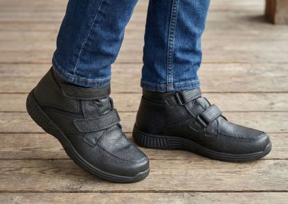 This boot takes functionality and comfort seriously, with a durable leather upper that supports ankles and looks good doing it. Swollen or sensitive feet? It doesn't matter, getting in is easy, with two adjustable straps and a tongue that all open. A wide toe box and extra depth ensure a pressure-free fit and adjustable Ortho-Cushion™ System support makes every step soft and stable.
