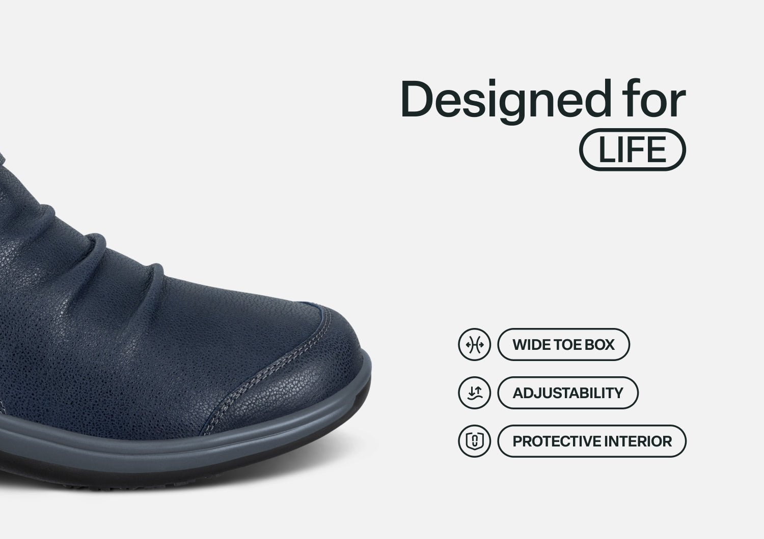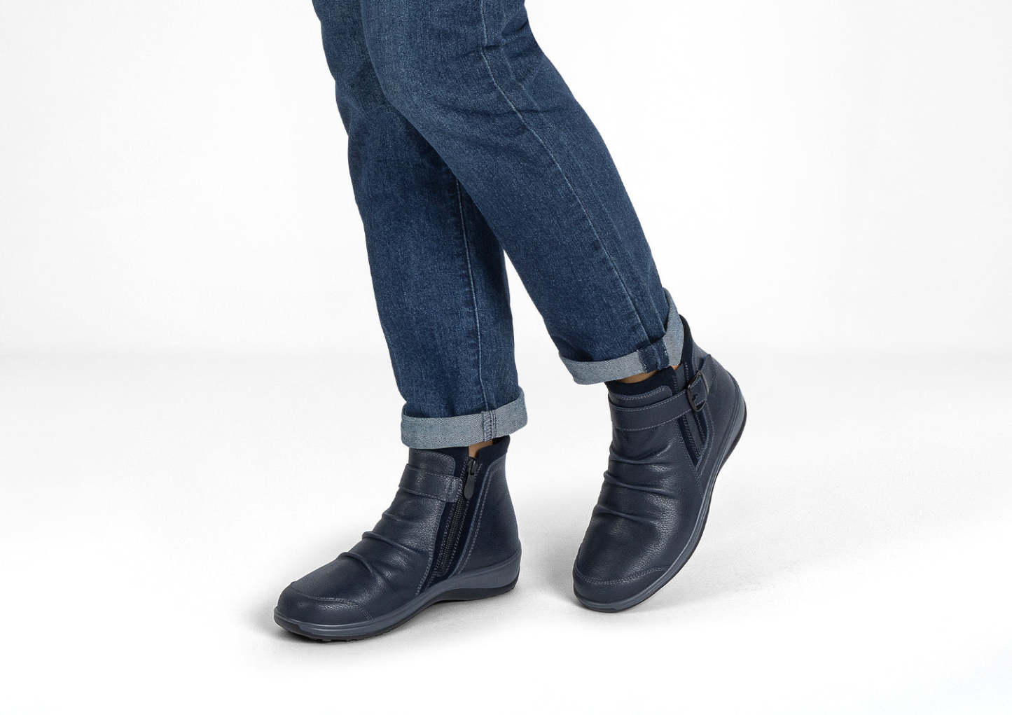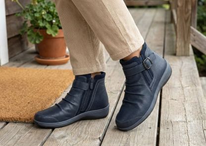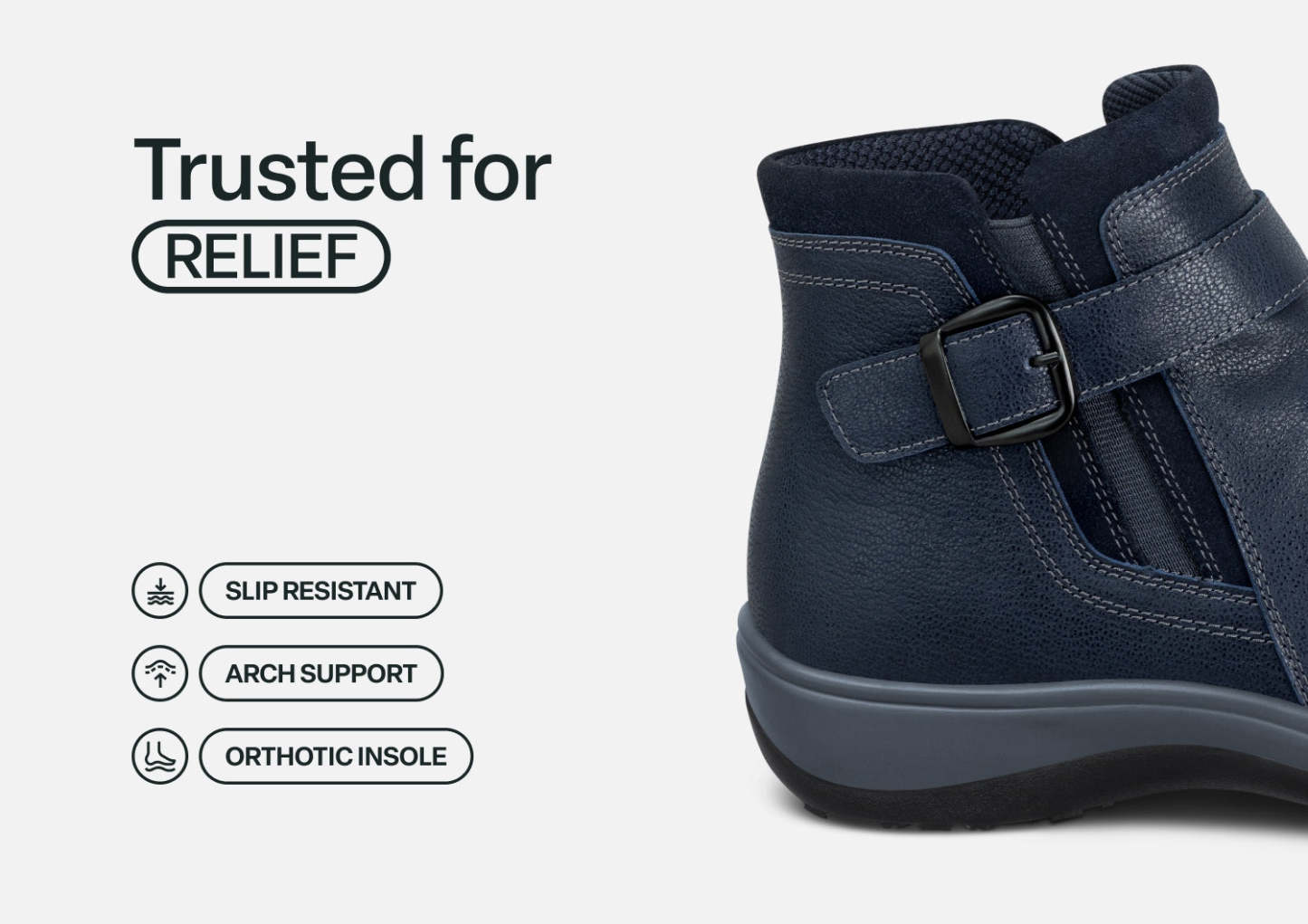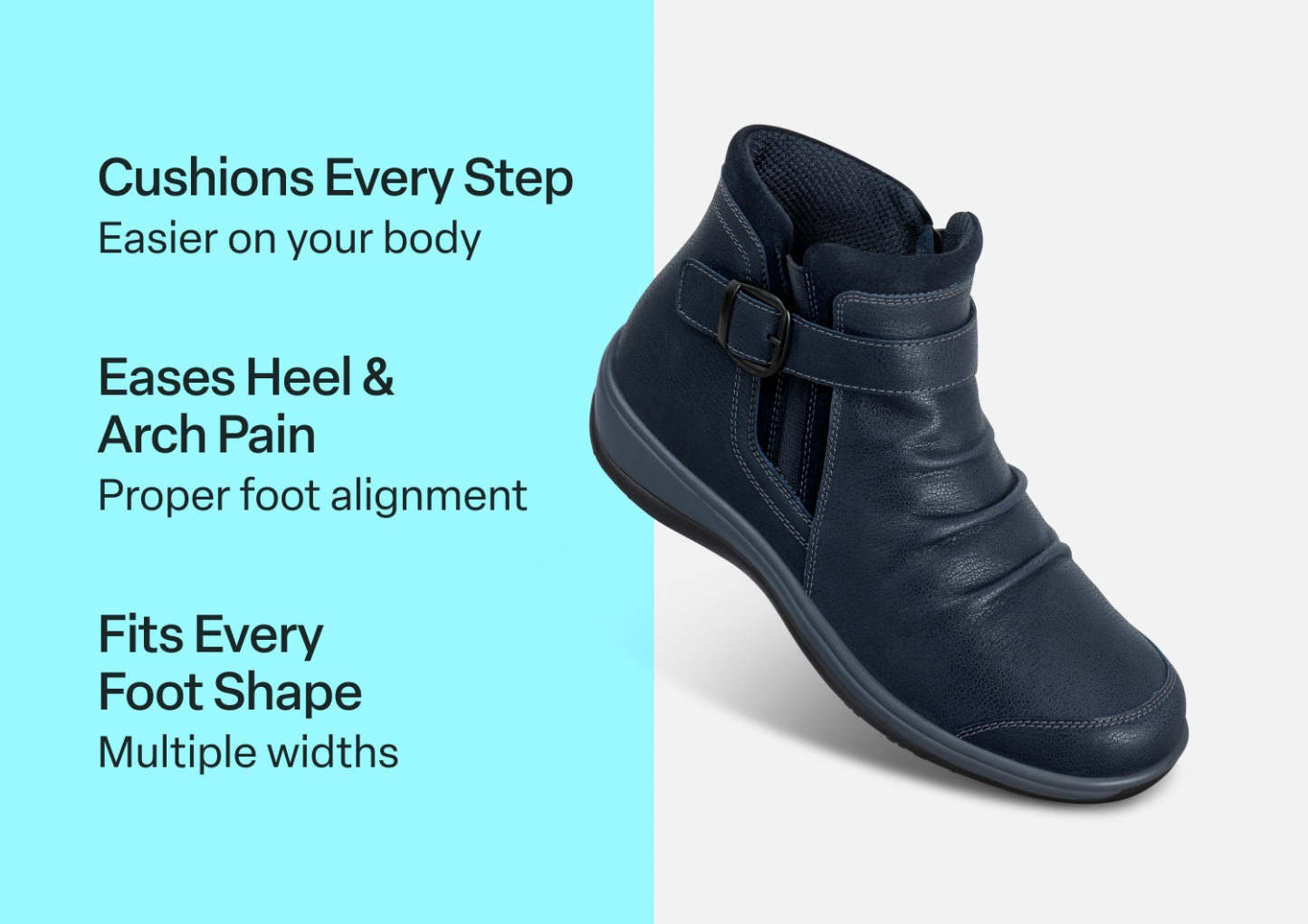 While an ultra-soft, "ruched" leather upper charms with its versatile style, innovative Orthofeet features make Heidi a go-to bootie for getting more out of your day. Use the zipper on the inner side for remarkably easy on & off. The adjustable buckle, over stretch gore on the outer side, adds comfort that moves with you. Step out confidently with the Ortho-Cushion™ System.