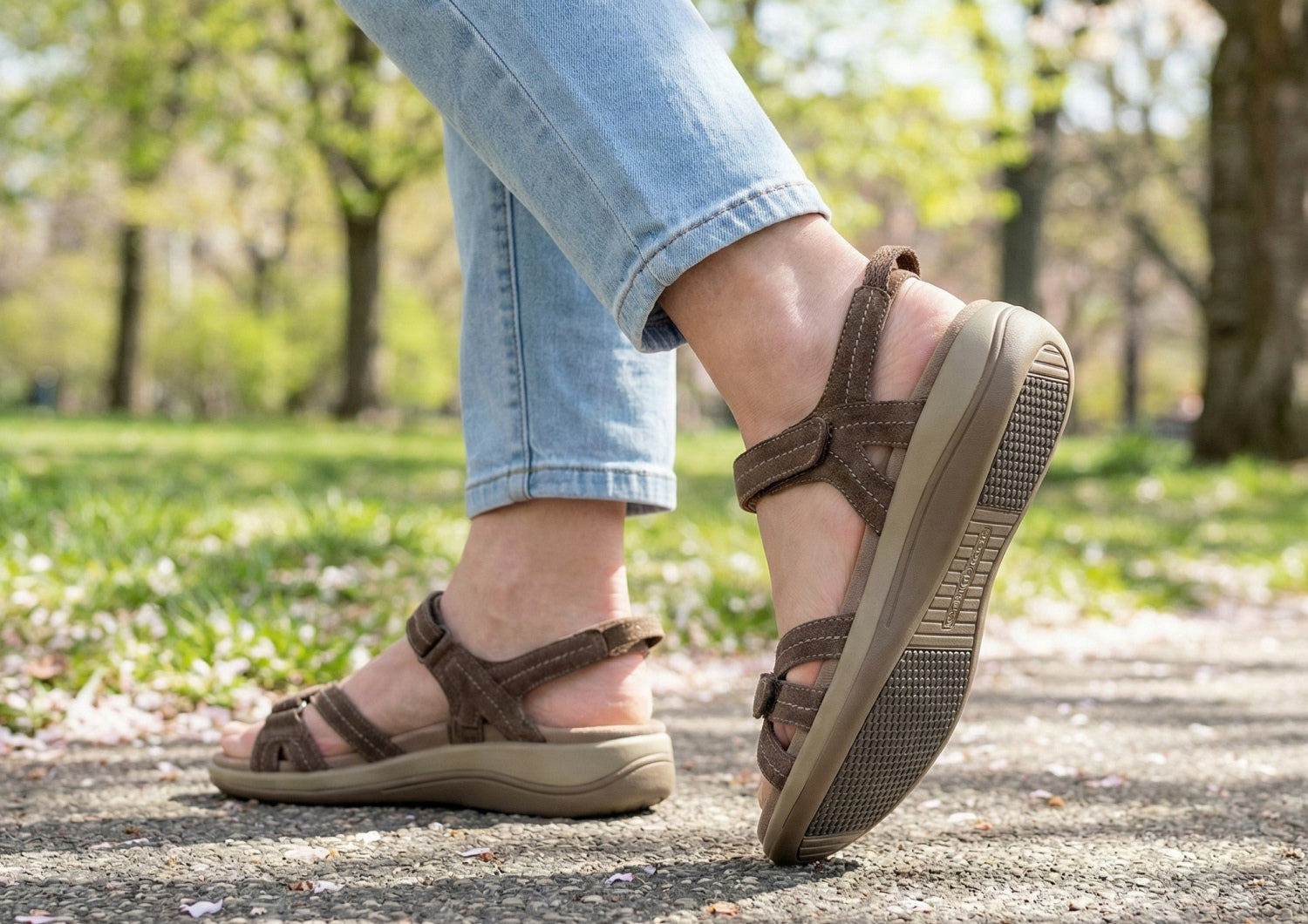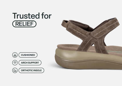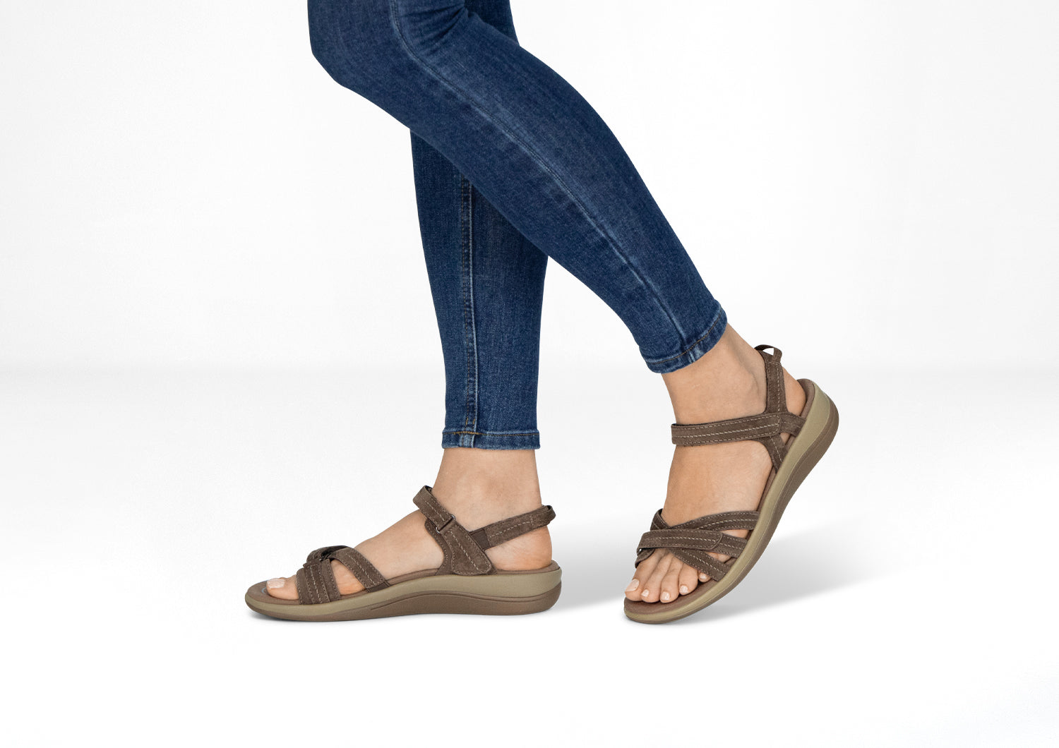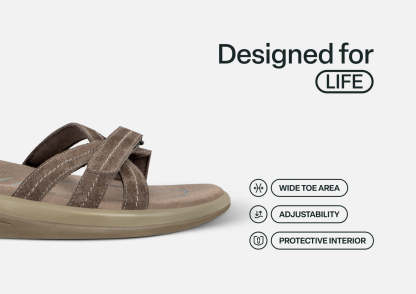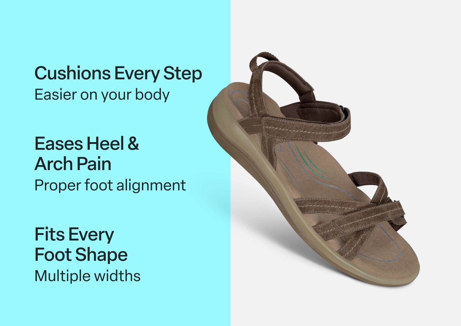 Feel light on your feet with this refined, spirited sandal. Adjust the unique "pocket" front strap to tailor your fit while avoiding bone pressure and sensitive conditions. It's surprisingly easy to get these on too, just open the adjustable two-way inset strap and slide in. Advanced Ortho-Cushion™ System engineering keeps every stride pain-free.