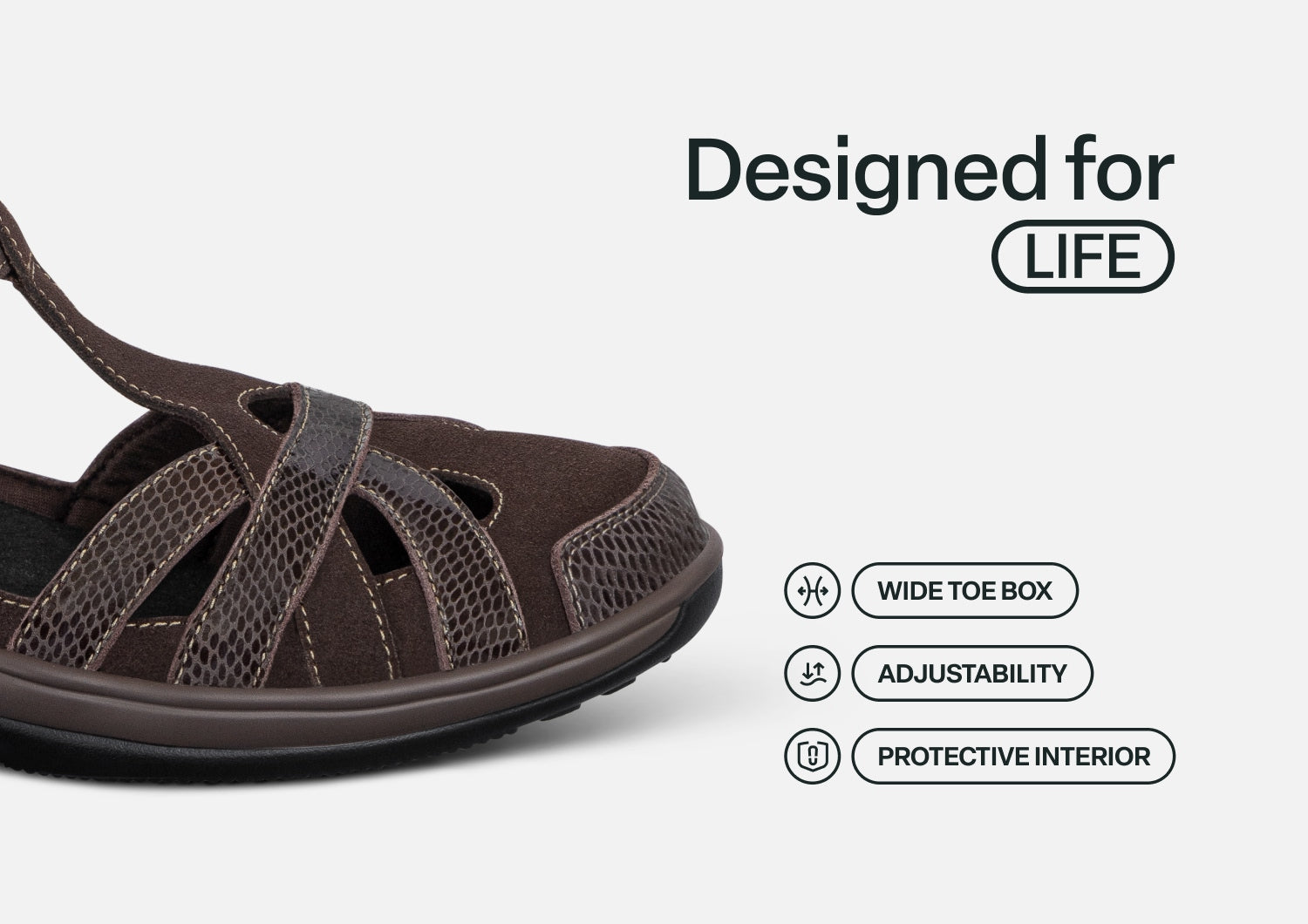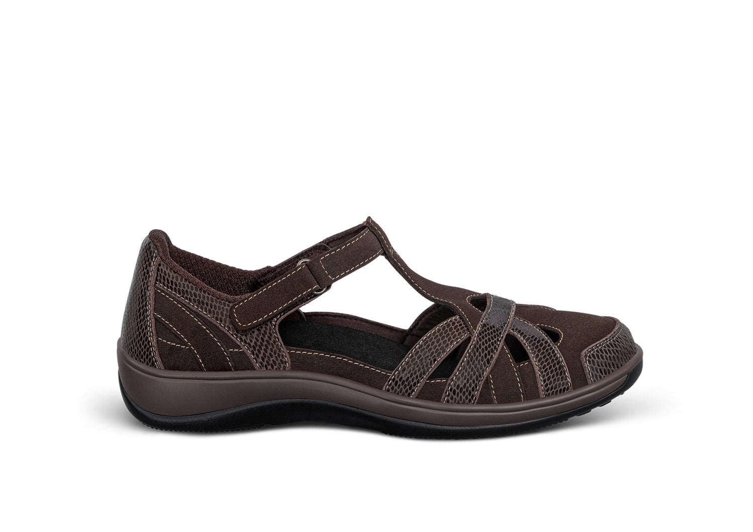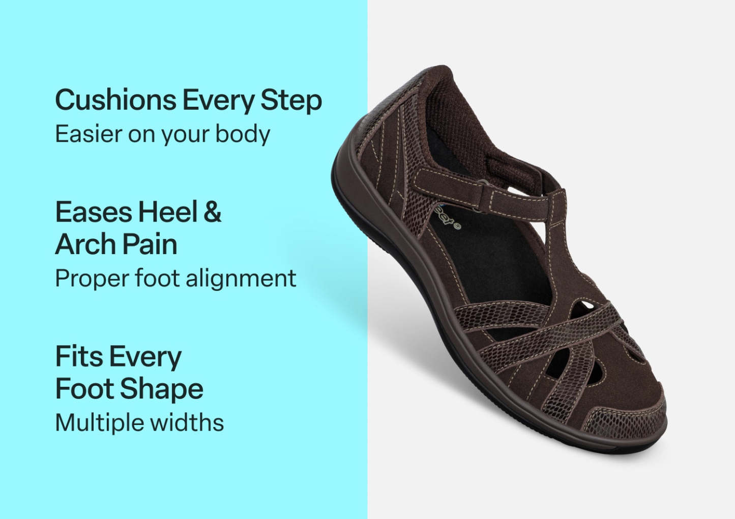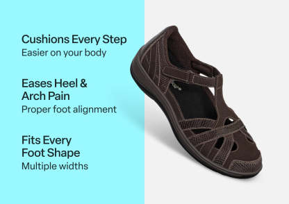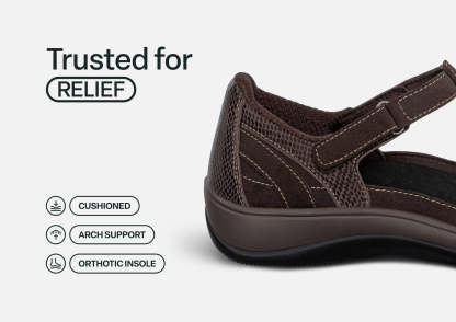 This airy Mary Jane gently wraps feet in suede and patent leather from the padded straps and heel to the stylish closed toe & perfect protection for spring or fall months. Adjustable straps open on both sides, making it easy to reach down and put Juno on. Heel-to-toe, customizable Ortho-Cushion™ System support and comfort, with extra depth, keeps feet pain-free all day.