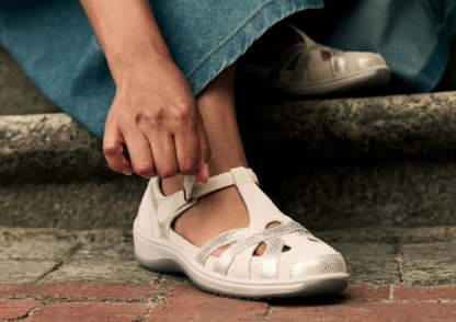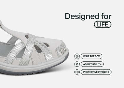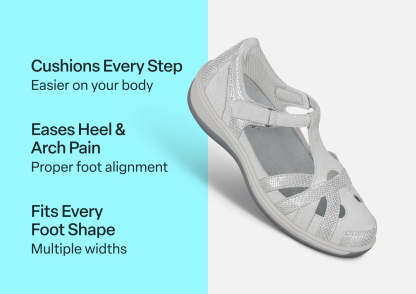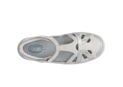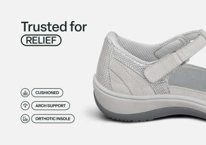 This airy Mary Jane gently wraps feet in suede and patent leather from the padded straps and heel to the stylish closed toe & perfect protection for spring or fall months. Adjustable straps open on both sides, making it easy to reach down and put Juno on. Heel-to-toe, customizable Ortho-Cushion™ System support and comfort, with extra depth, keeps feet pain-free all day.