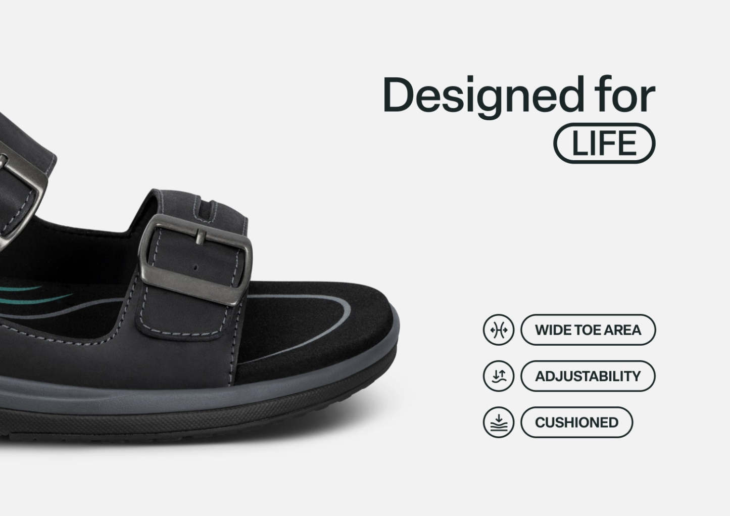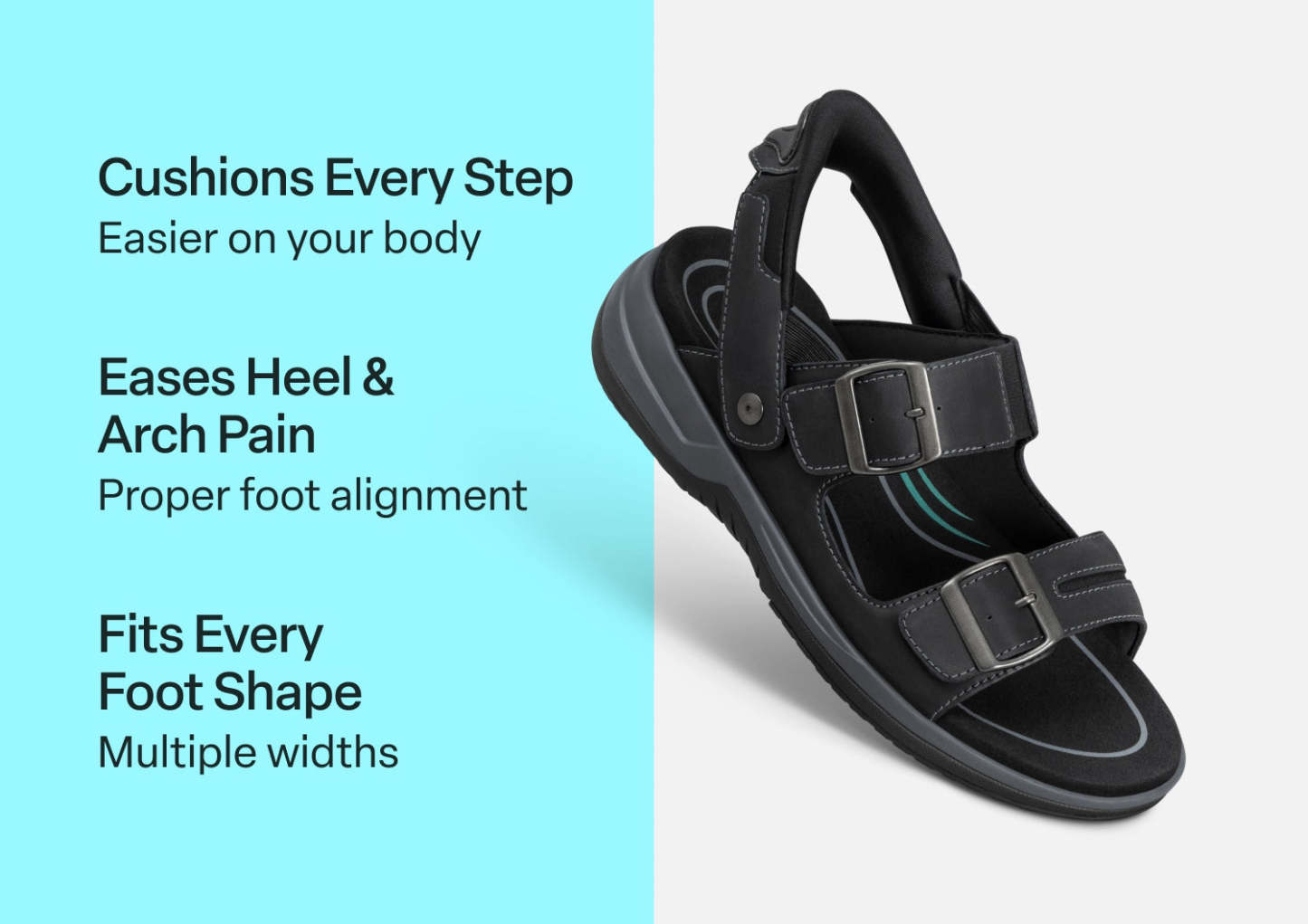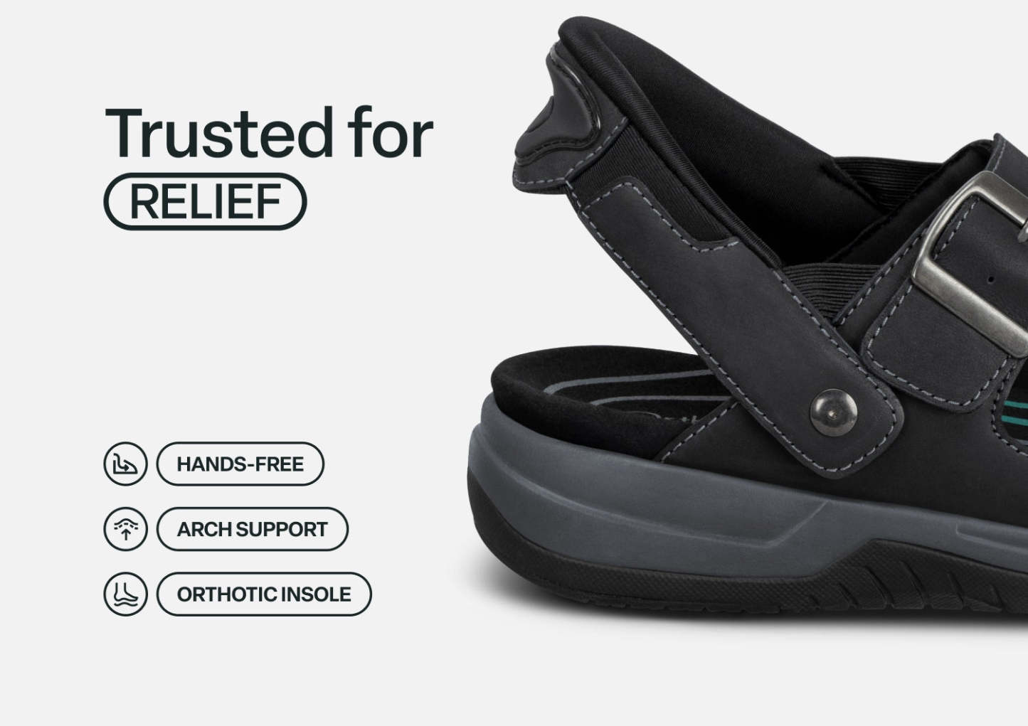 Discover powerful warm weather comfort, now in an easy-walking, healthy leather sandal. No need to bend down, with our patented hands-free technology you can just step in and go! The buckles are decorative, just pull the midfoot and forefoot strap to set an ideal fit or open them completely. Your world awaits, with advanced support and heel-to-toe pain relief by Orthofeet.