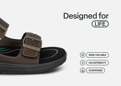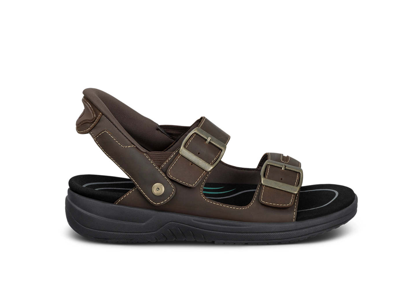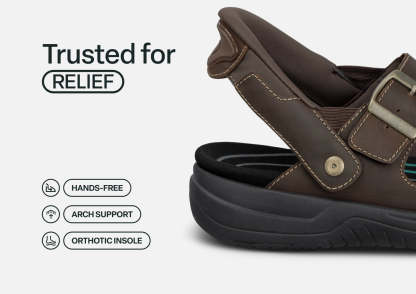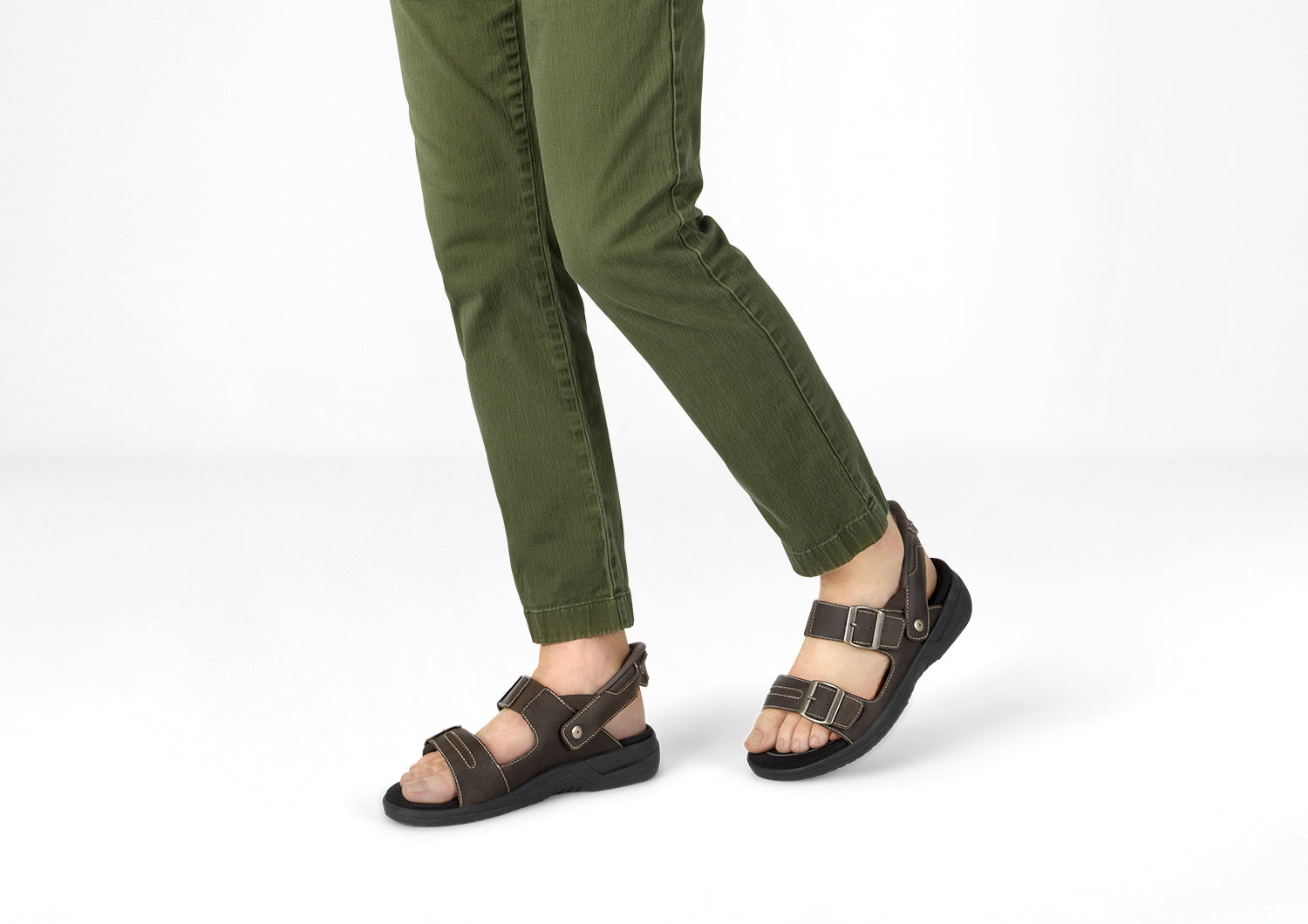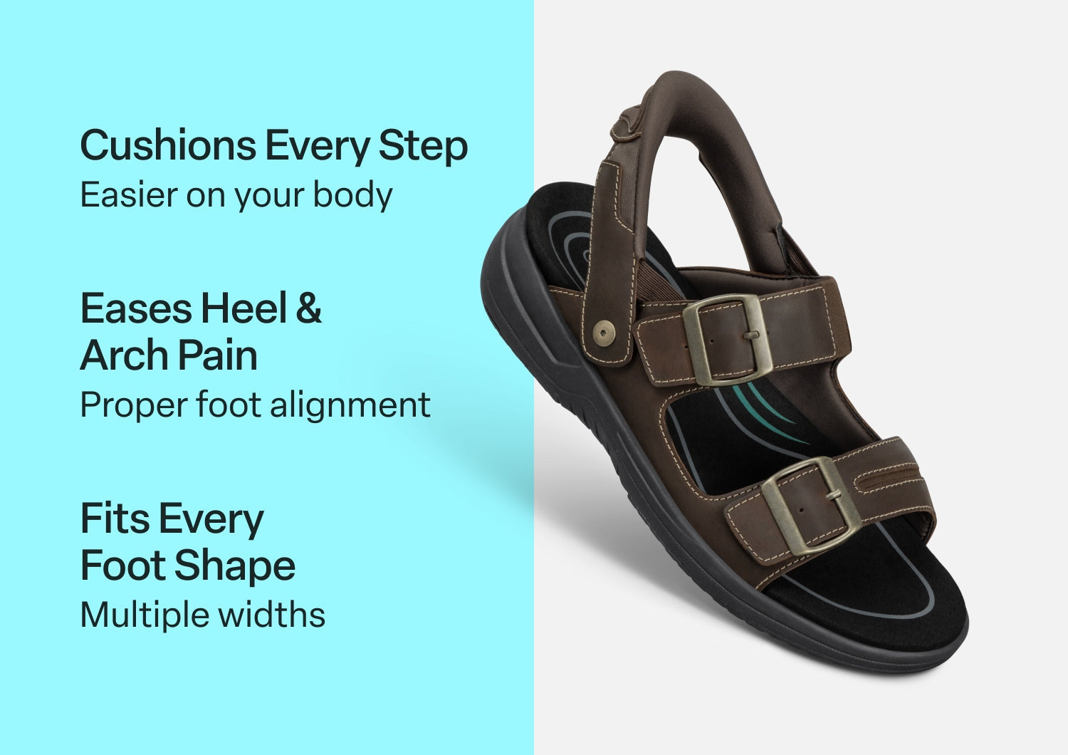 Discover powerful warm weather comfort, now in an easy-walking, healthy leather sandal. No need to bend down, with our patented hands-free technology you can just step in and go! The buckles are decorative, just pull the midfoot and forefoot strap to set an ideal fit or open them completely. Your world awaits, with advanced support and heel-to-toe pain relief by Orthofeet.
