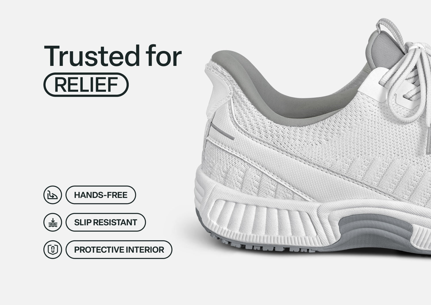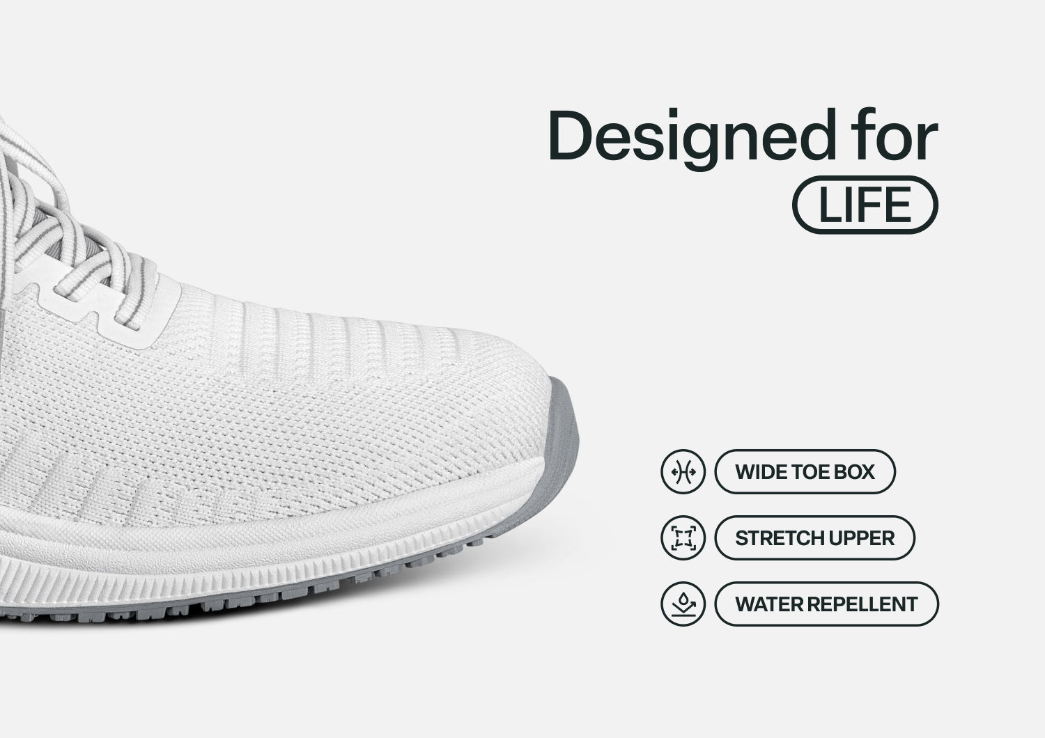 Kita's clean sporty design features our revolutionary hands-free slip-on technology. Tie the laces once, then never bend over to tie them again & just step in, without worrying about them slipping off when walking. From the water-repellant stretchable fabric uppers to the Ortho-Cushion™ System, Kita changes the game for mobility, support and comfort.