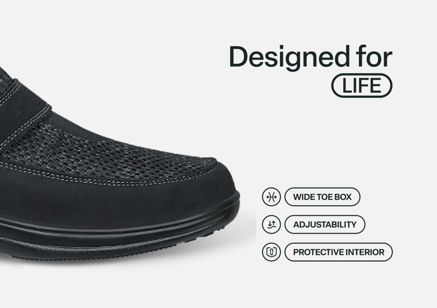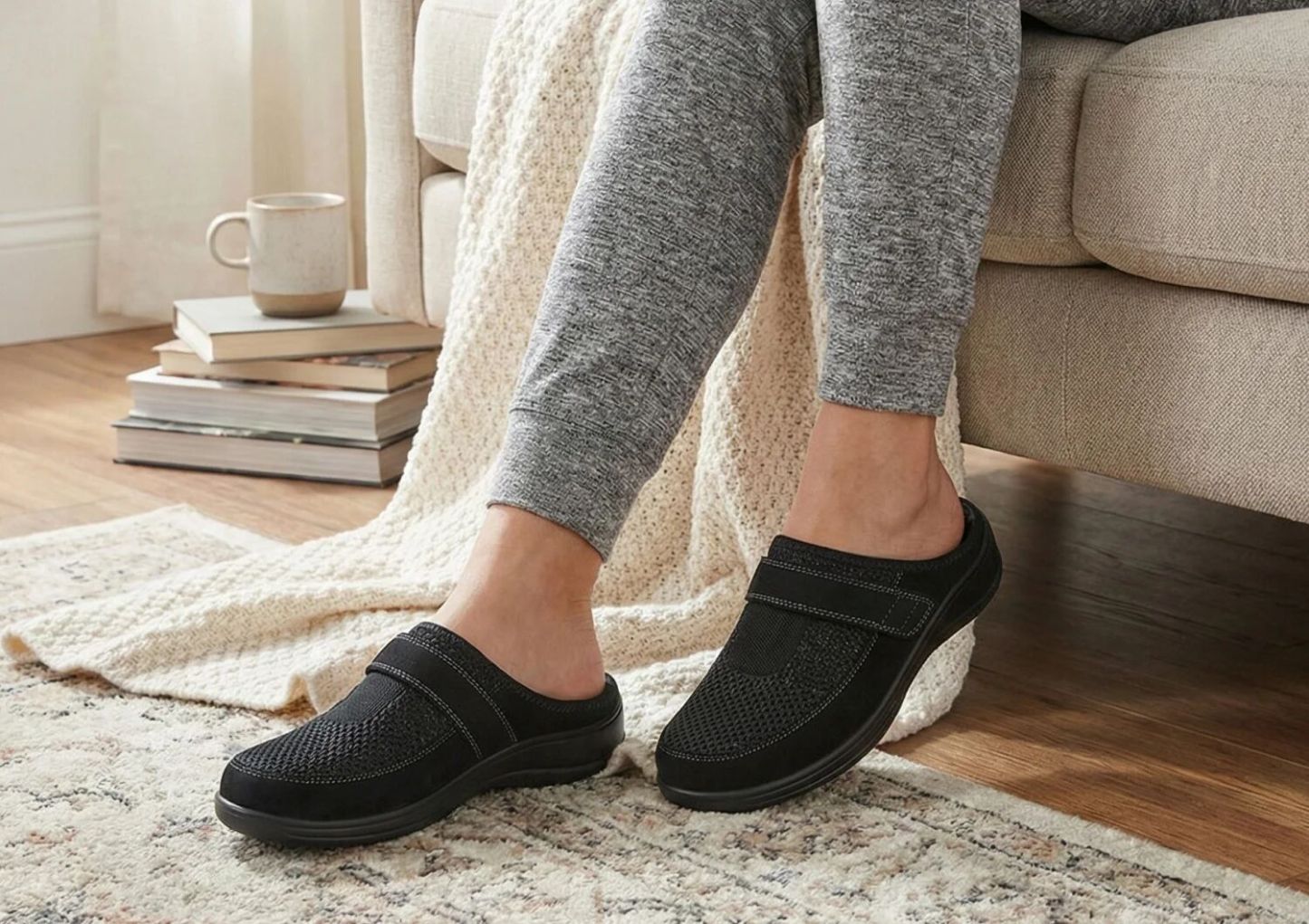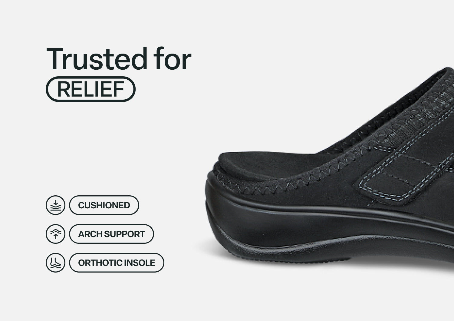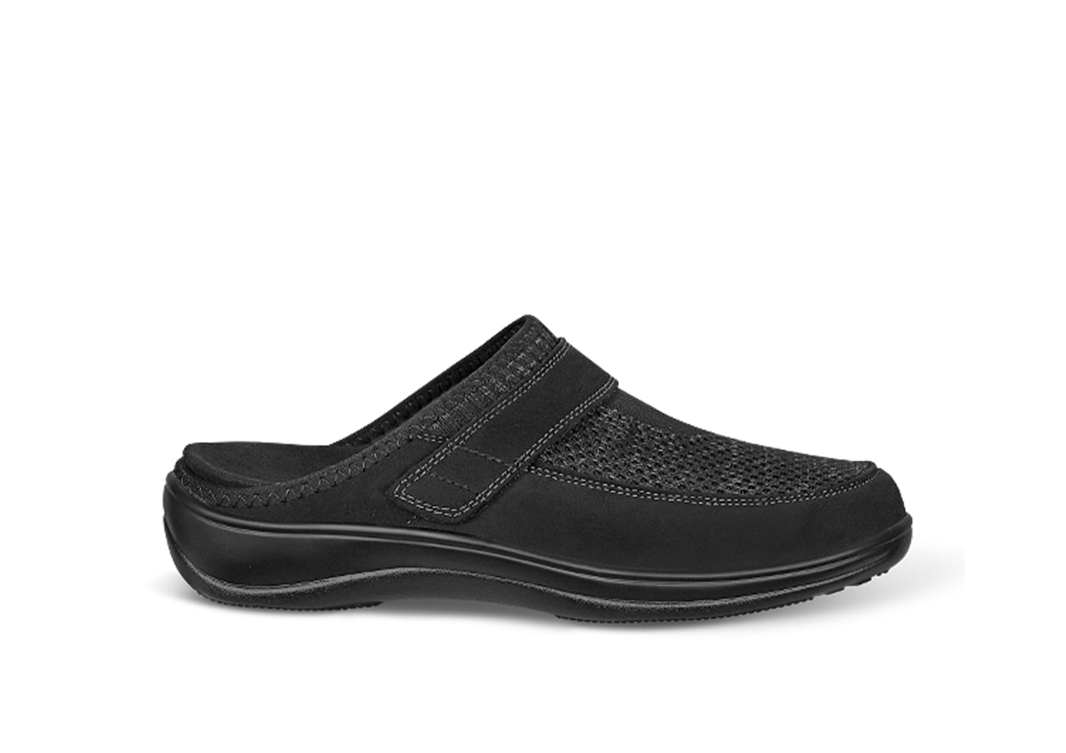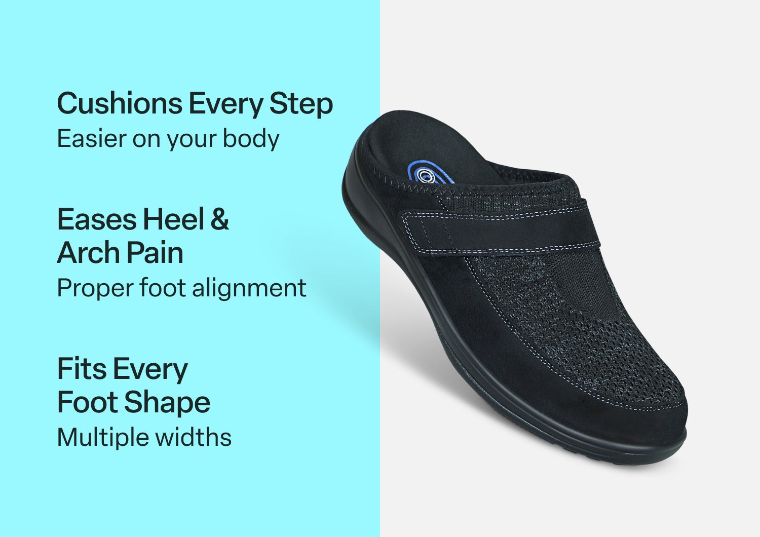 Active support, a pressure-free fit and pain-relieving comfort are in the house. Louise hugs your feet in stretchable mesh that follows every curve, bump and bone, and the adjustable strap secures your fit for effortless indoor living. With anatomical arch support and all the mobility advantages of Ortho-Cushion™ System support and cushioning, these slippers save every day.