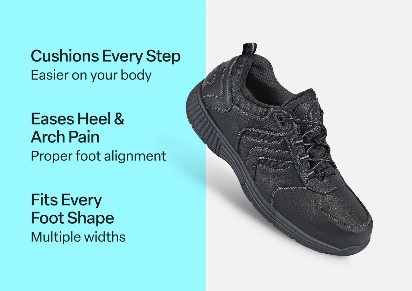 Look good indoors and out, rain or shine with this durable, easy-to-clean men's sneaker in soft waterproof leather. Inside, we've eliminated any seams that could irritate sensitive feet. With the adjustable support and customizable comfort of our advanced Ortho-Cushion™ System, extra depth and a roomy toe box, you're ready for hours on your feet that leave pain behind.