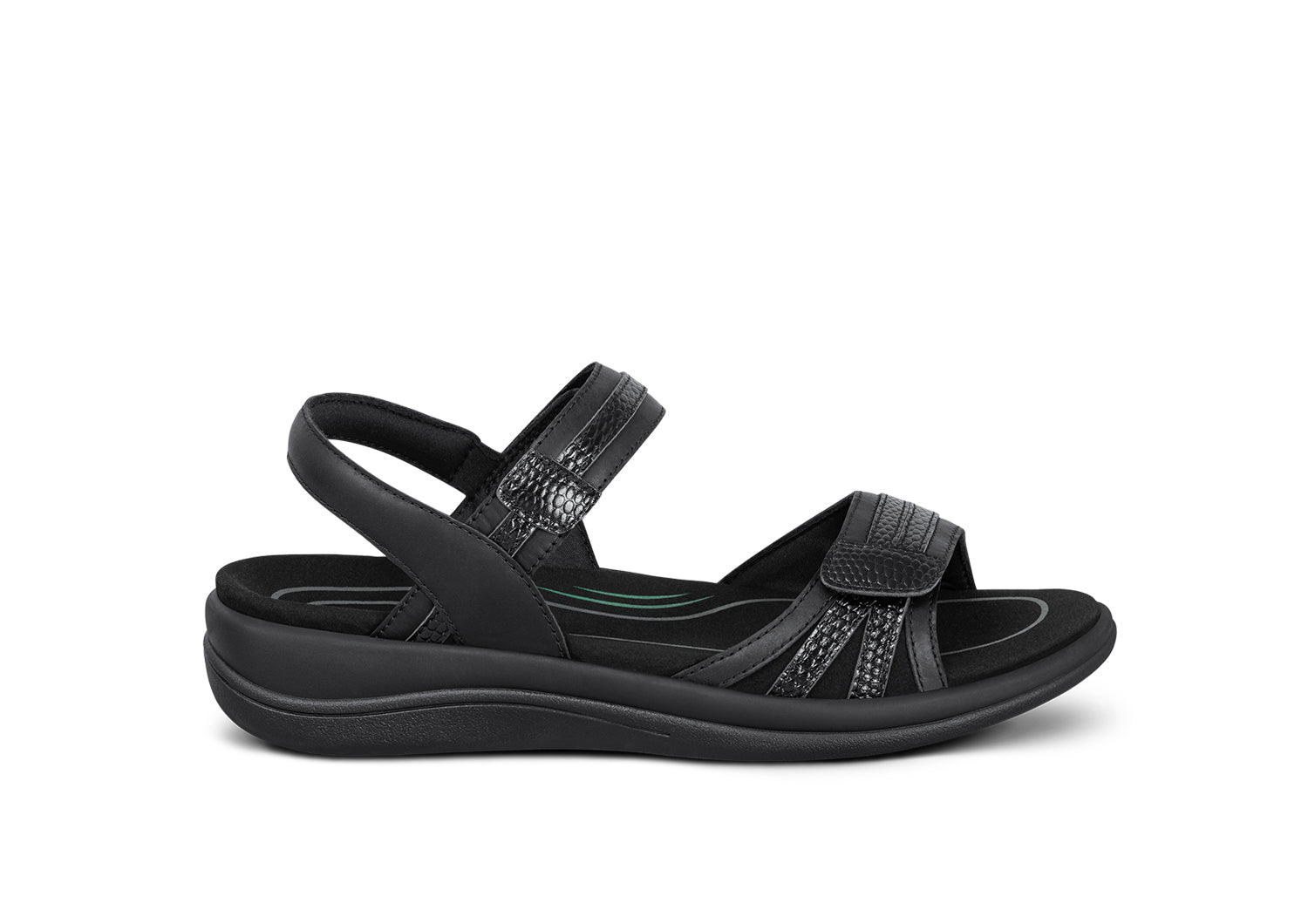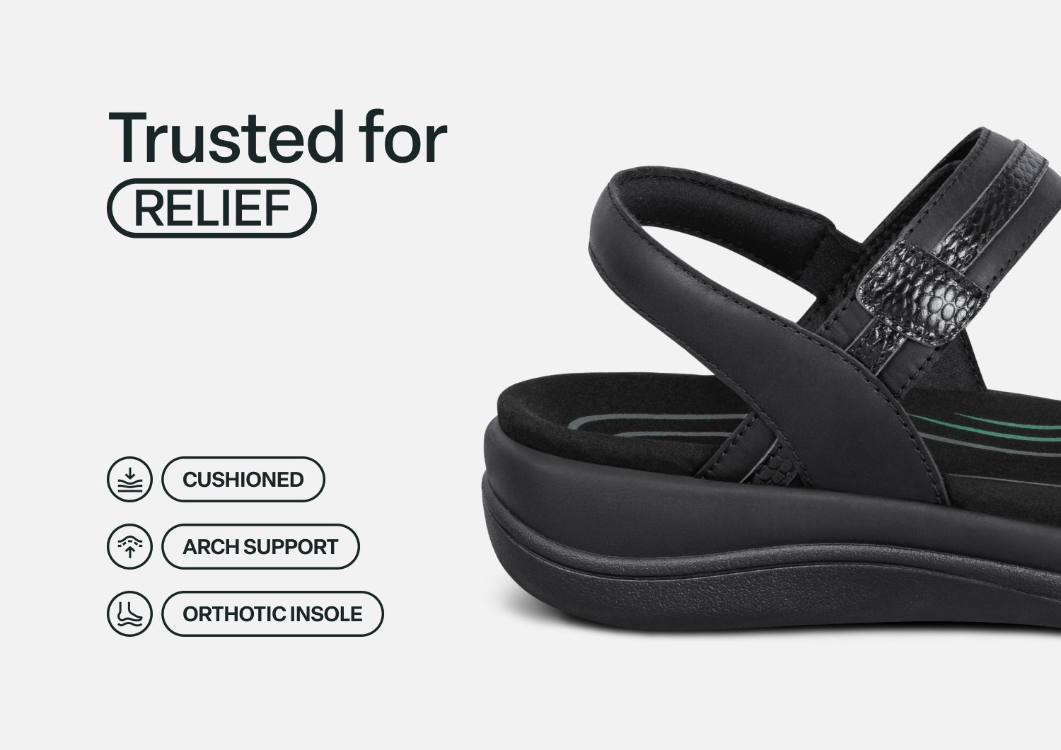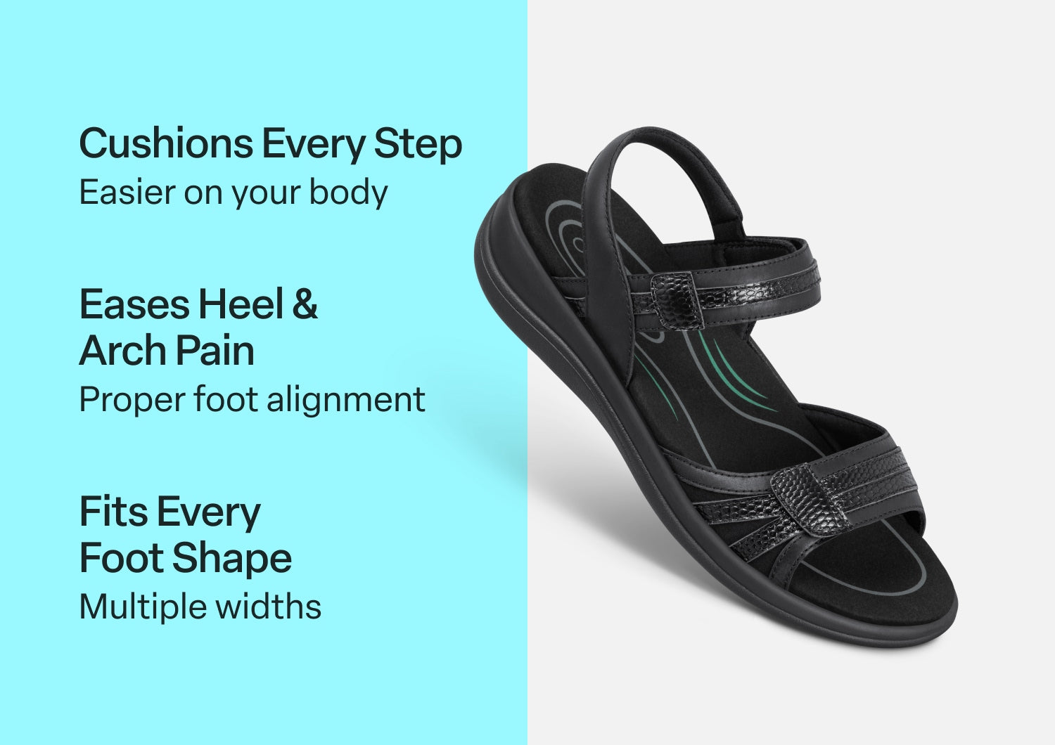 Step into beautifully detailed leather and premium all-day comfort. The fully adjustable front strap opens completely, and the adjustable inset strap opens with a tab, making it a breeze to get these on and off. Enjoy a secure, personal fit with clever design features that avoid bone pressure and sensitive areas, and customizable Ortho-Cushion™ System support for everywhere you go.