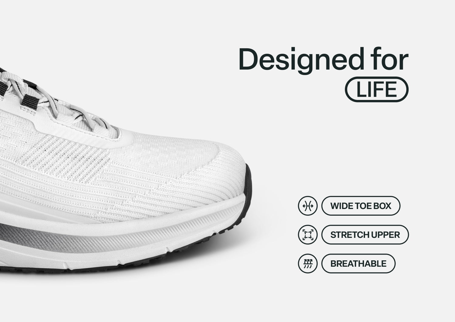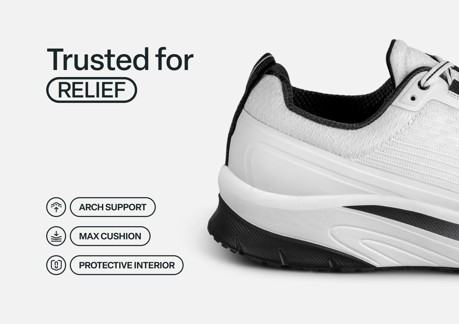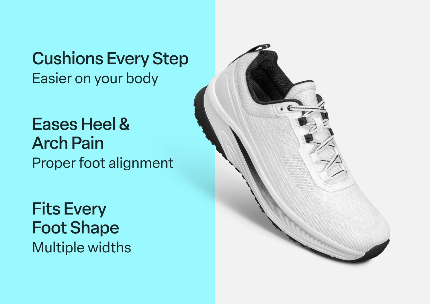 Conquer every mile in Race, our ultimate men's athletic shoe featuring breathable mesh uppers and our advanced Ortho-Cushion™ System that transforms impact into energy. The wide toe box reduces pressure on sensitive areas, while the grippy sole maintains confident traction on any surface. Push your limits without pushing through pain—podiatrist-recommended comfort that keeps your mobility in the lead.