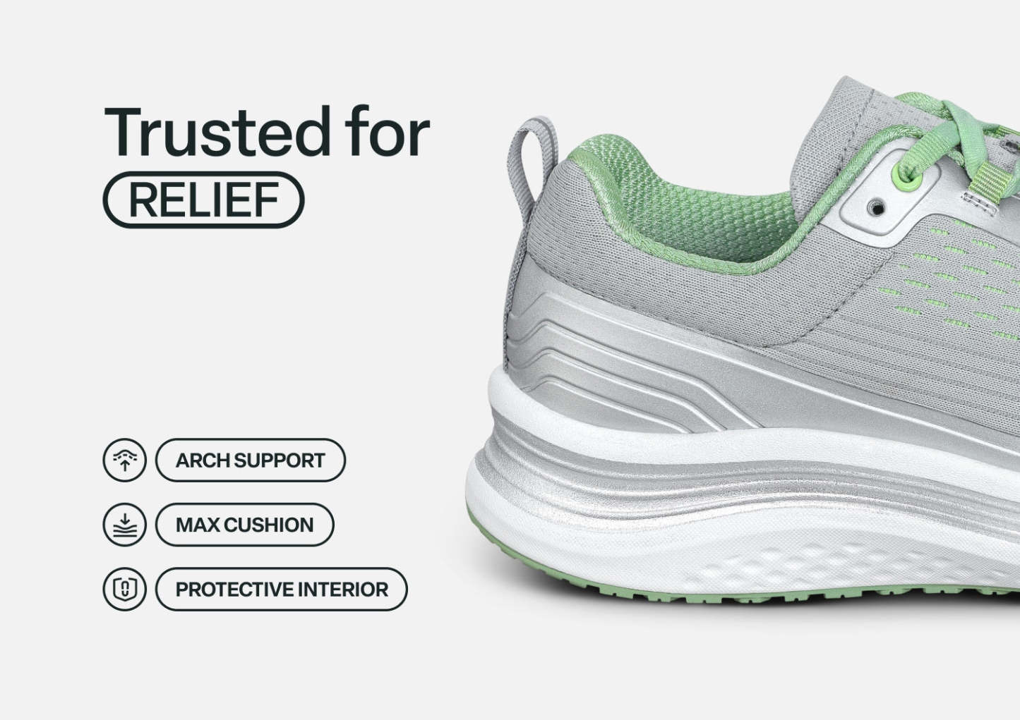 Get ready for podiatrist-recommended comfort that's born to run. From the lightweight breathable nylon upper to the stable, high traction outsole, Relay keeps your mobility in the lead. Leave pain behind with a heel-to-toe max cushioned sole and a near custom fit, while the Ortho-Cushion™ System offloads pressure and aligns ergonomic support for every stride.
