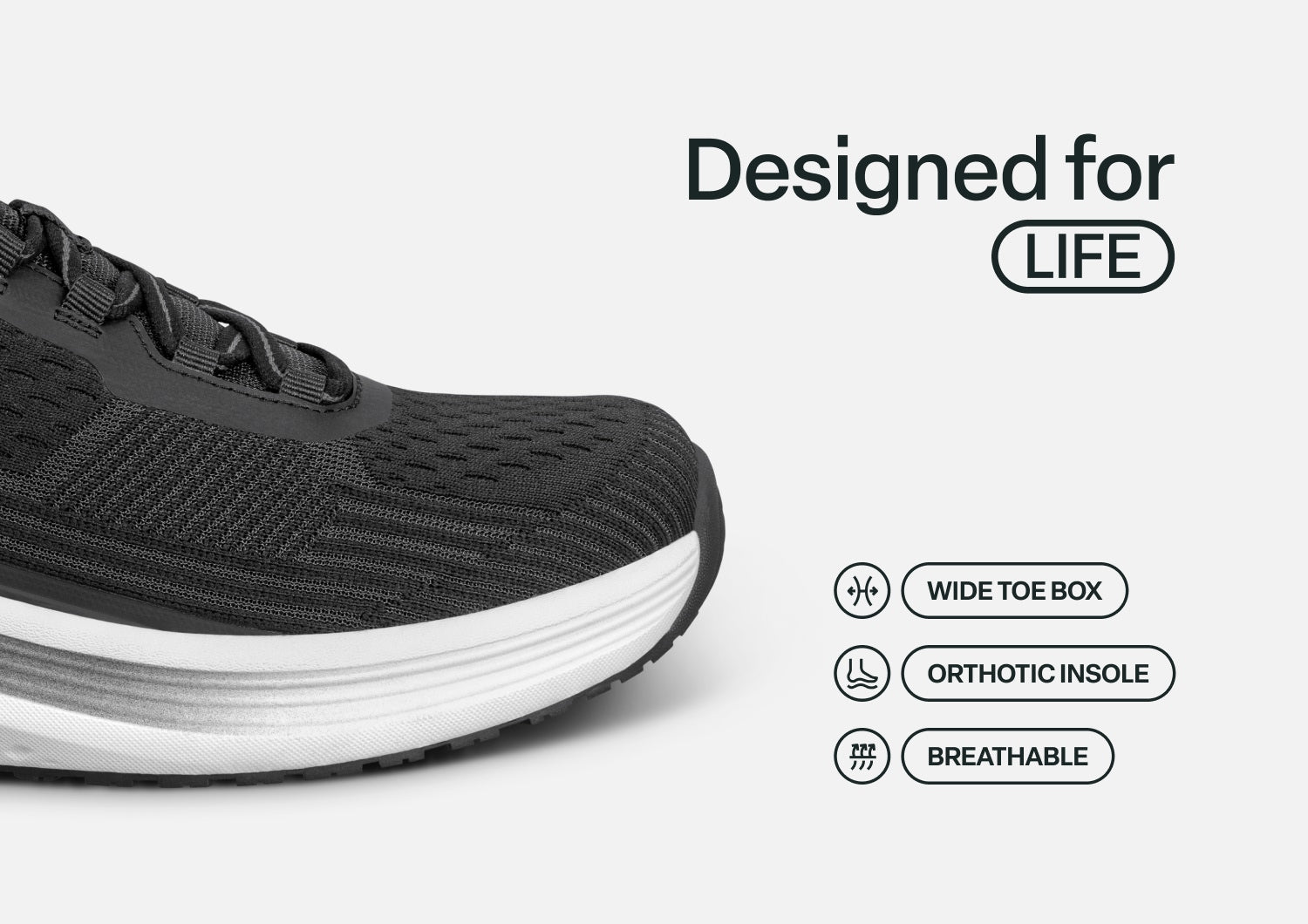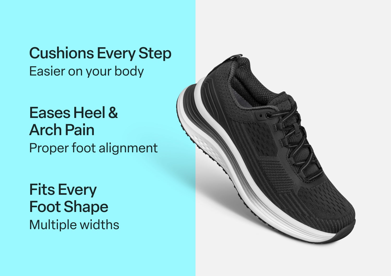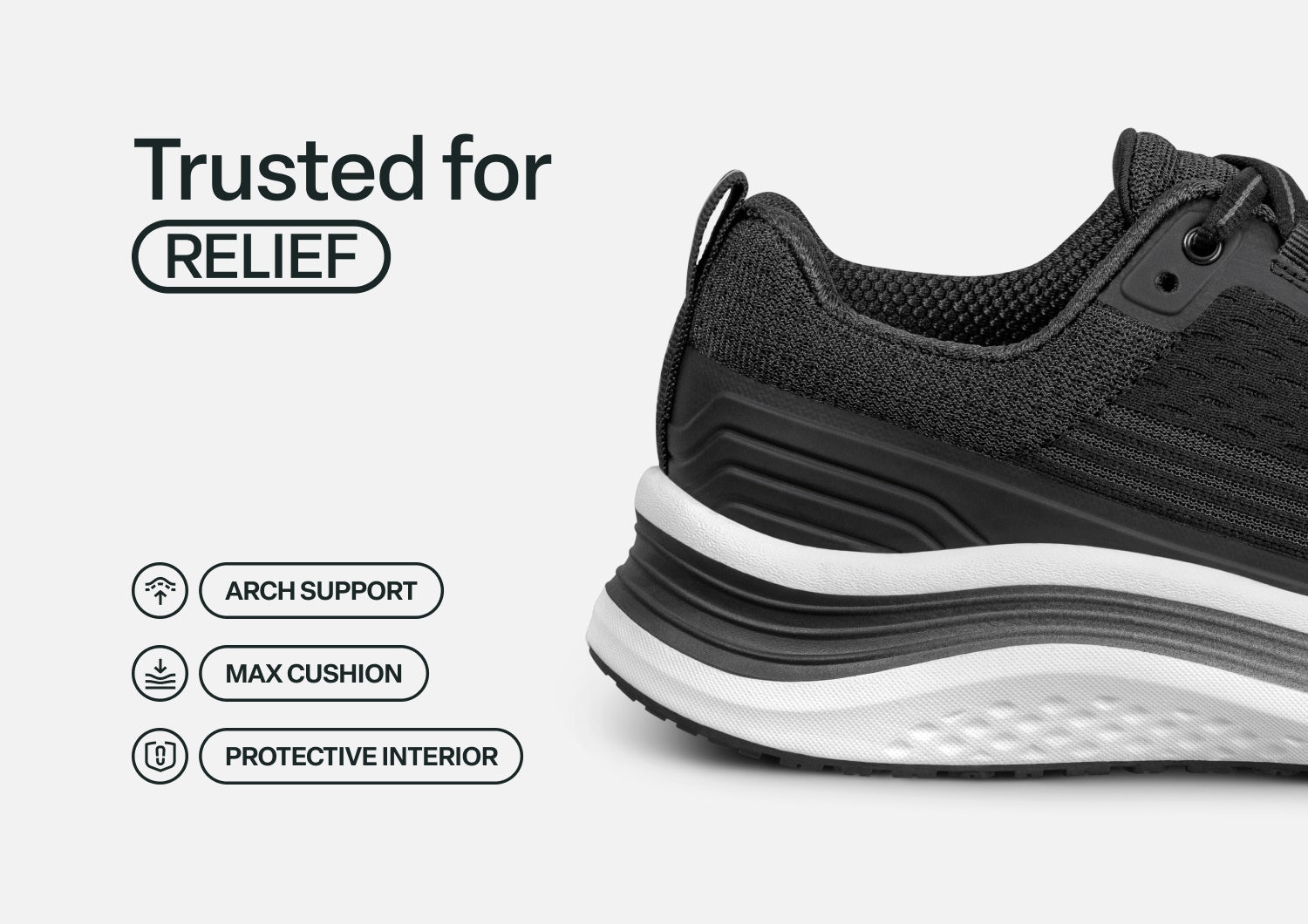 Get ready for podiatrist-recommended comfort that's born to run. From the lightweight breathable nylon upper to the stable, high traction outsole, Relay keeps your mobility in the lead. Leave pain behind with a heel-to-toe max cushioned sole and a near custom fit, while the Ortho-Cushion™ System offloads pressure and aligns ergonomic support for every stride.