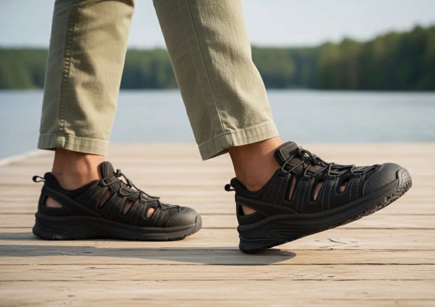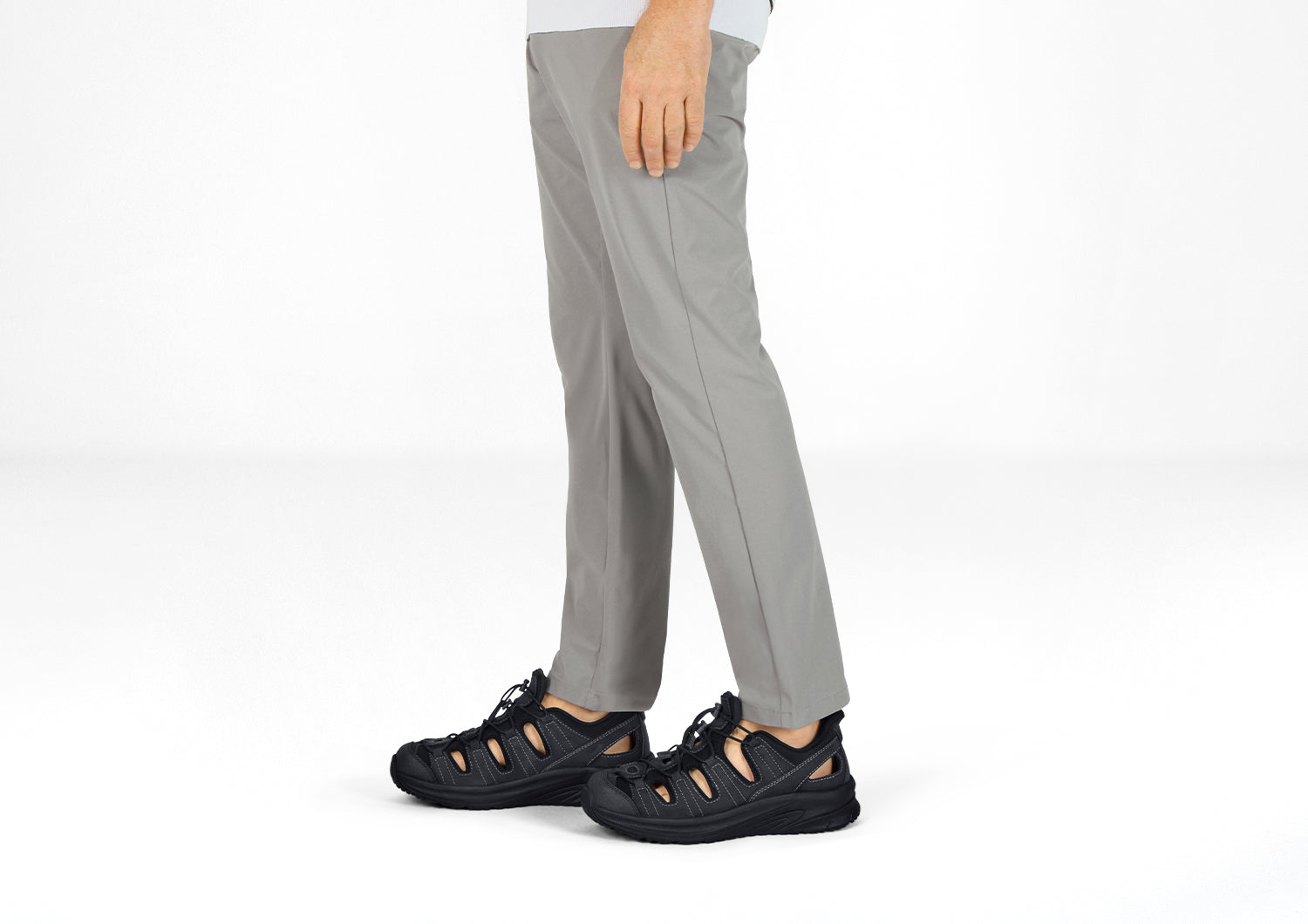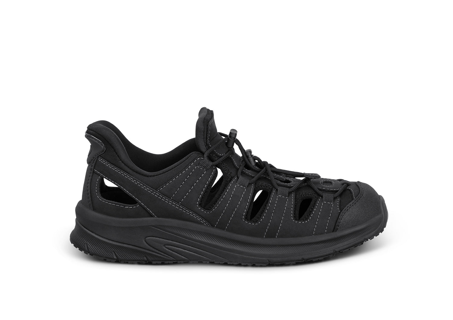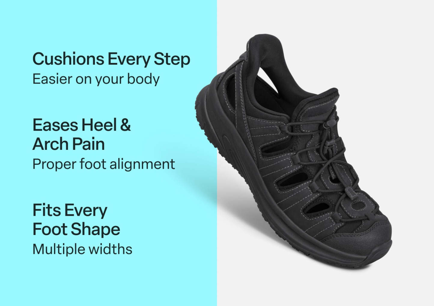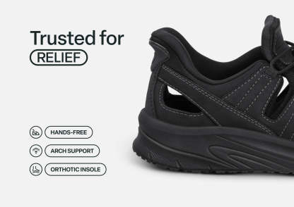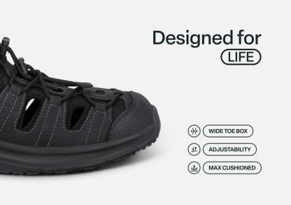 Slip into out-of-this-world ventilated walking comfort. Saturn features our patented hands-free design in a closed-toe leather sandal. Set your custom fit with two bungee laces per foot. Then take the scenic route with a stable, max cushion sole and heel-to-toe Ortho-Cushion™ System pain-relief. A rubber sole enhances traction on a variety of surfaces.