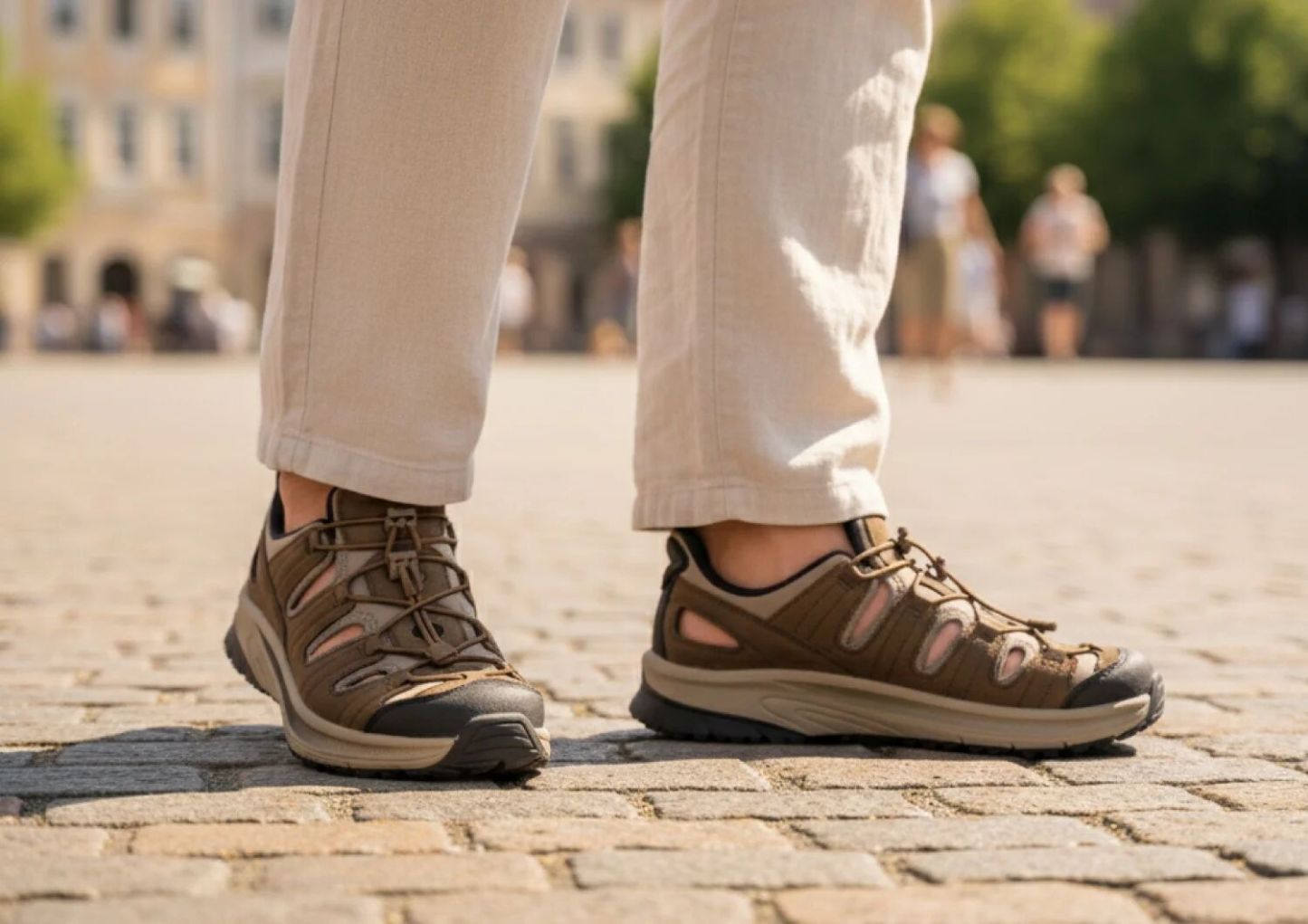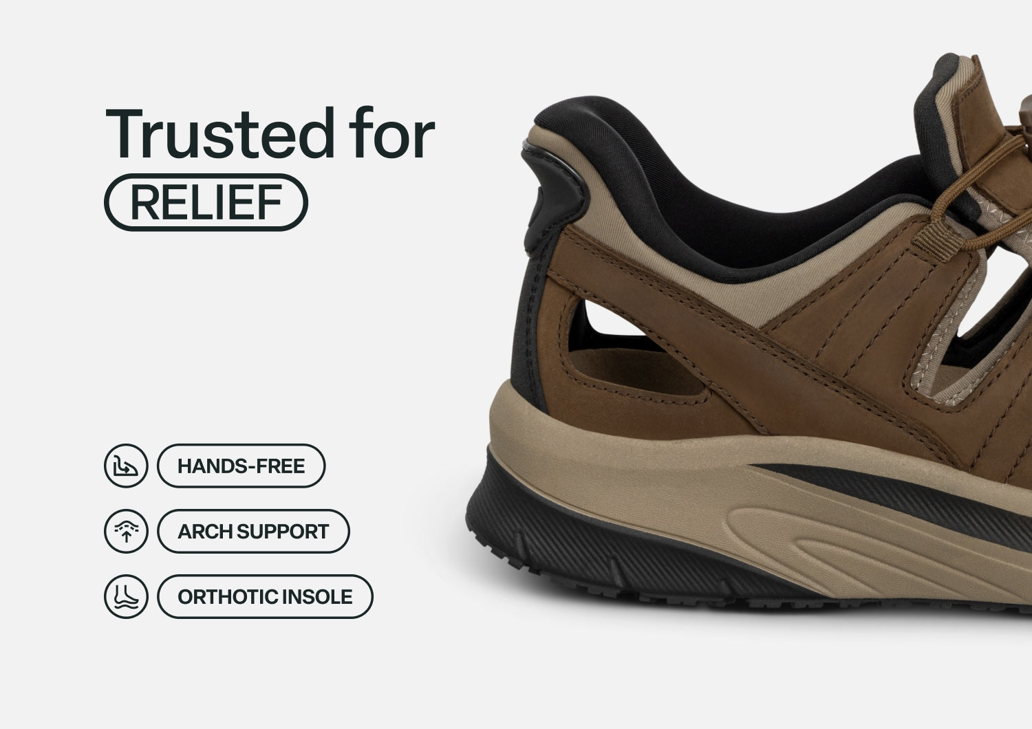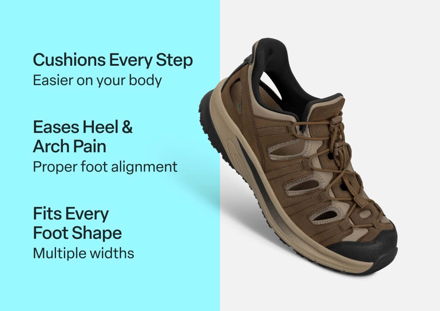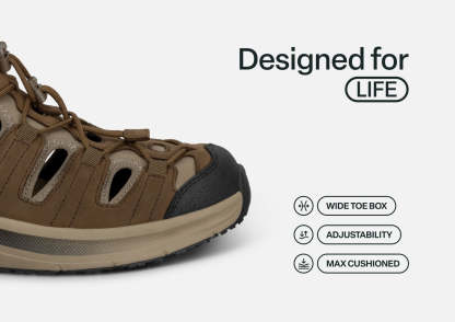 Slip into out-of-this-world ventilated walking comfort. Saturn features our patented hands-free design in a closed-toe leather sandal. Set your custom fit with two bungee laces per foot. Then take the scenic route with a stable, max cushion sole and heel-to-toe Ortho-Cushion™ System pain-relief. A rubber sole enhances traction on a variety of surfaces.
