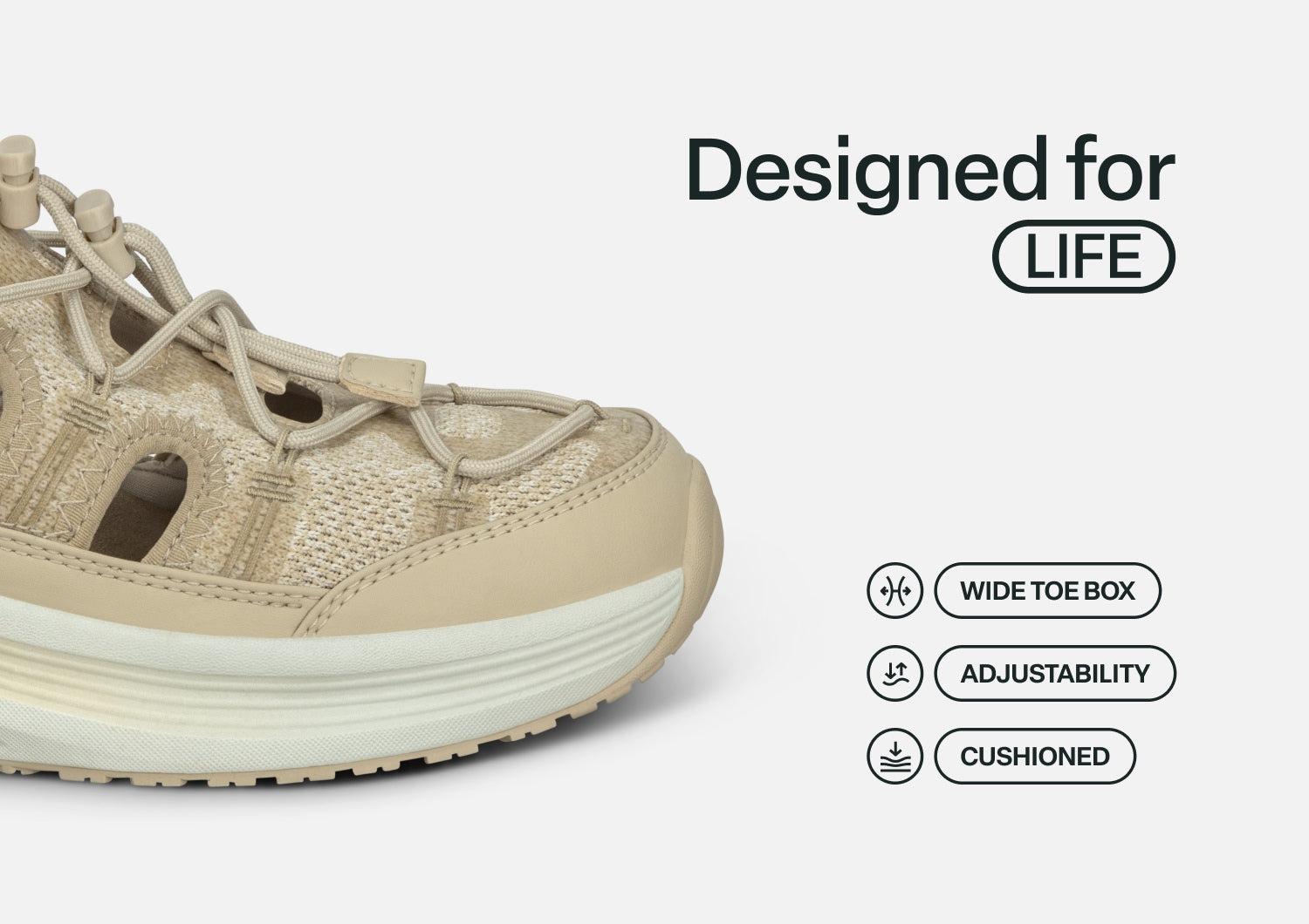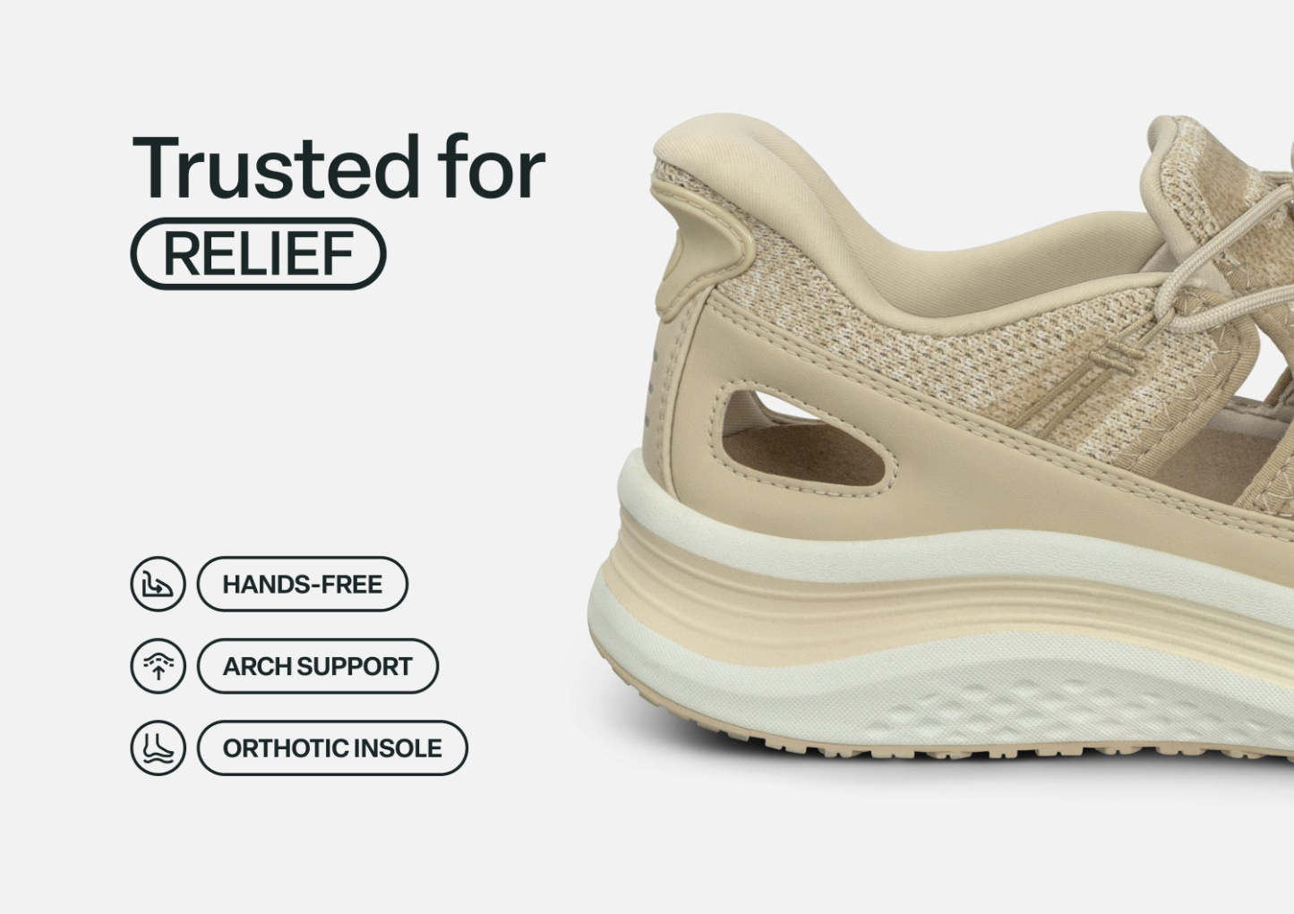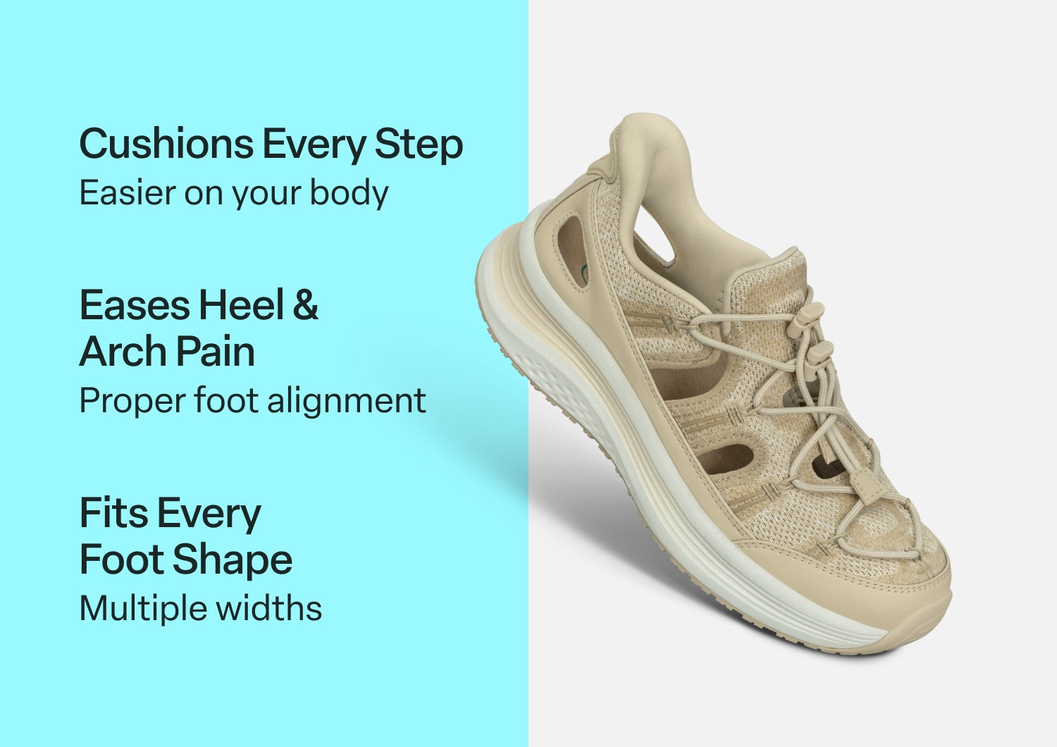 Slide into these closed toe sandals & enjoy unearthly comfort in warm weather. With our patented hands-free design, there’s no bending or tying. Dual bungee laces and stretchy uppers contour your fit. Ortho-Cushion™ System support, with a max cushion sole, aligns and propels every step. And a slip-resistant tread has great grip, even on wet surfaces.