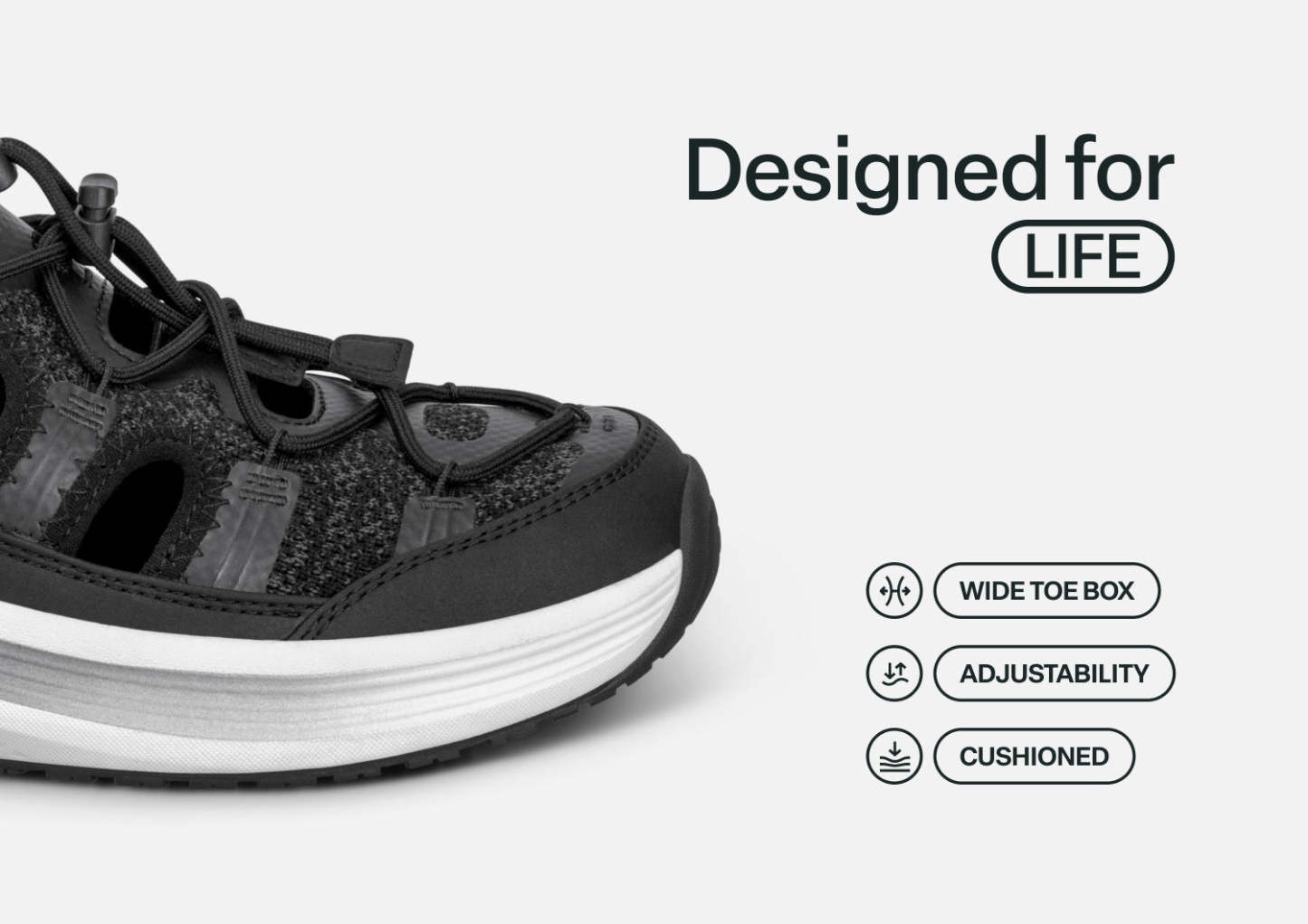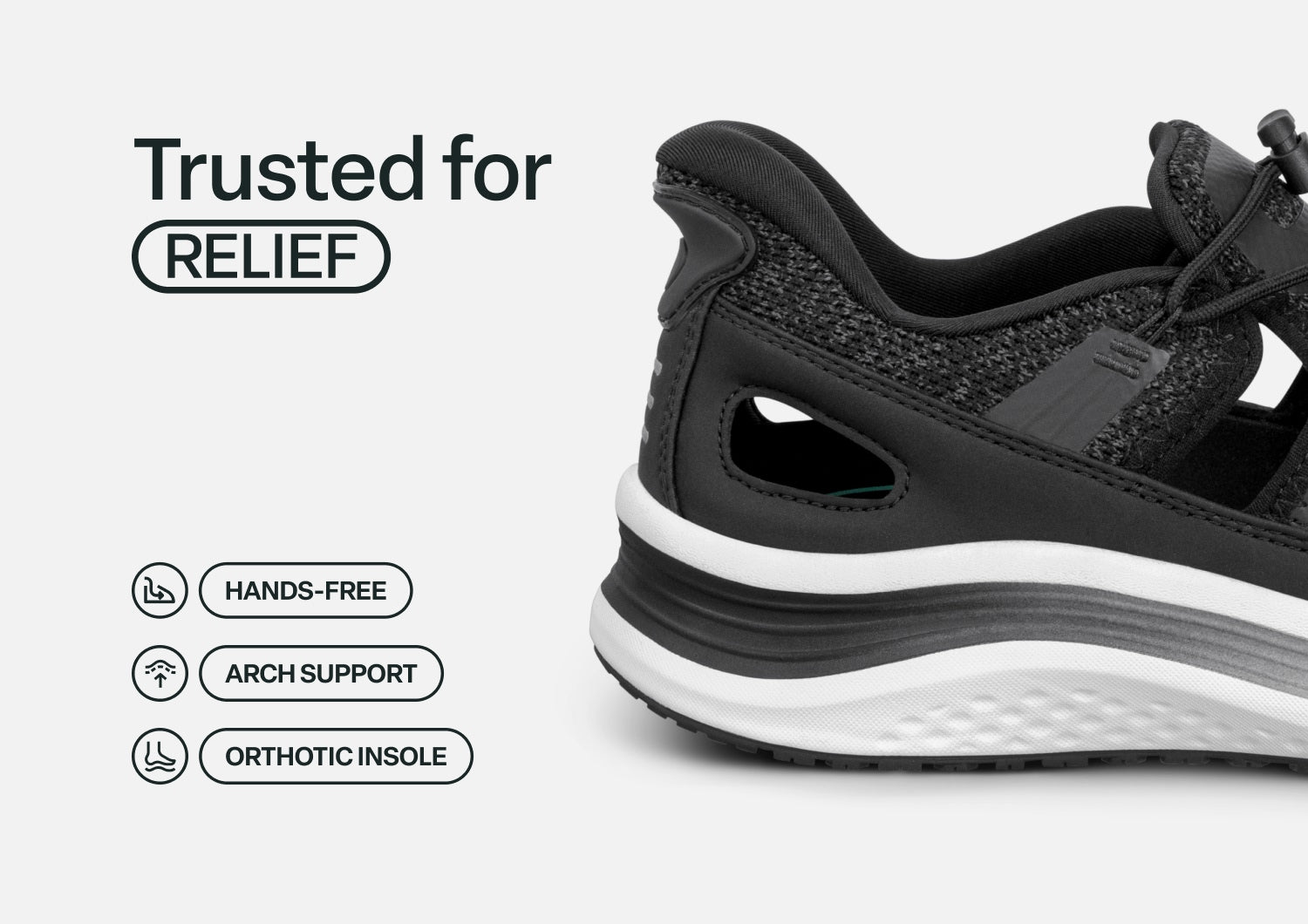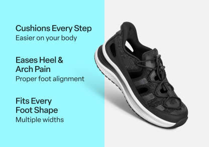 Slide into these closed toe sandals & enjoy unearthly comfort in warm weather. With our patented hands-free design, there’s no bending or tying. Dual bungee laces and stretchy uppers contour your fit. Ortho-Cushion™ System support, with a max cushion sole, aligns and propels every step. And a slip-resistant tread has great grip, even on wet surfaces.
