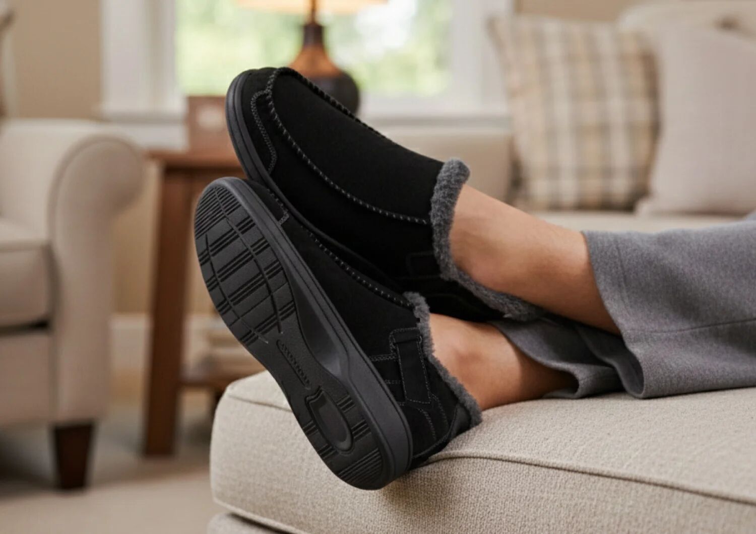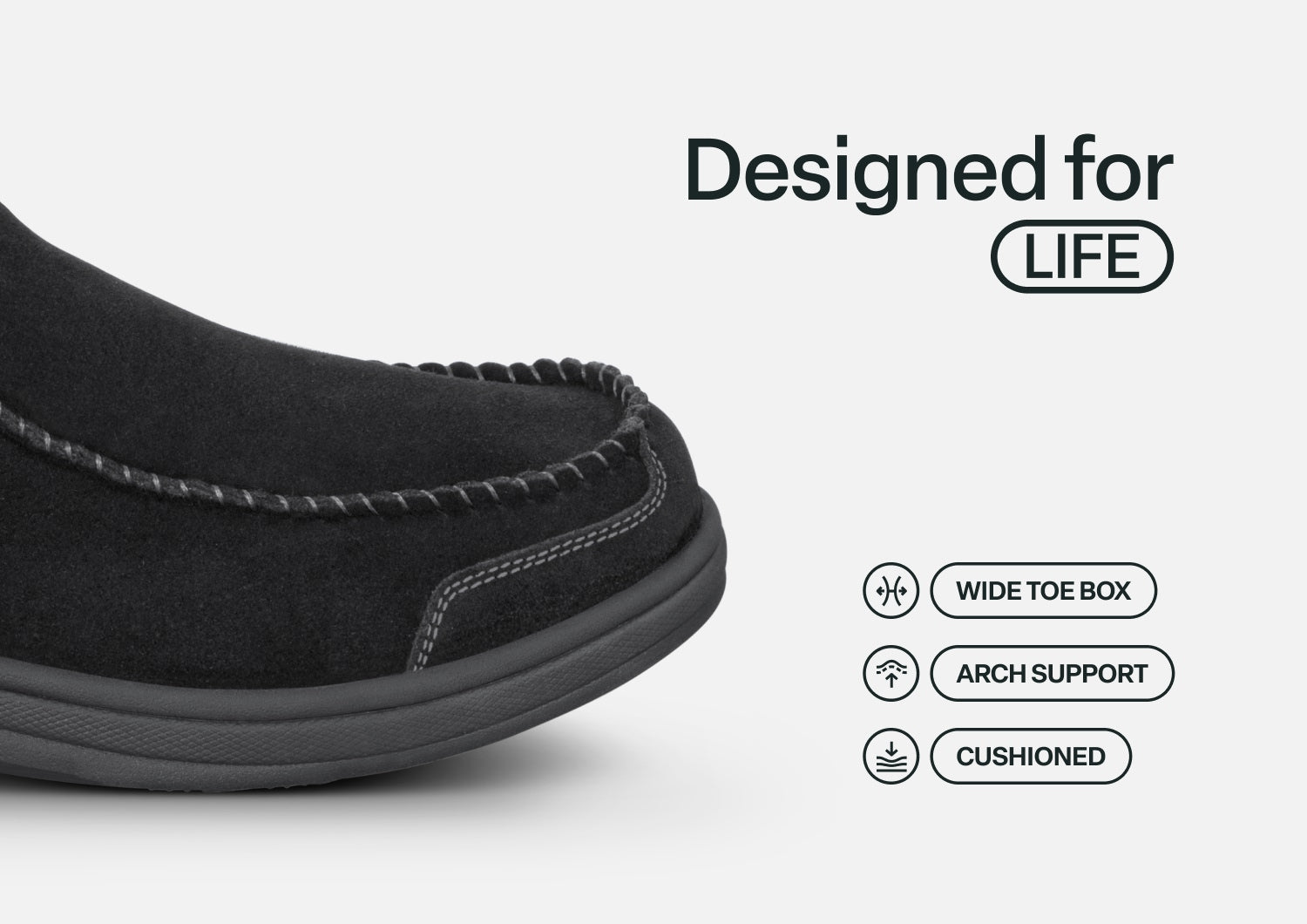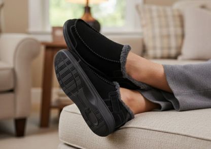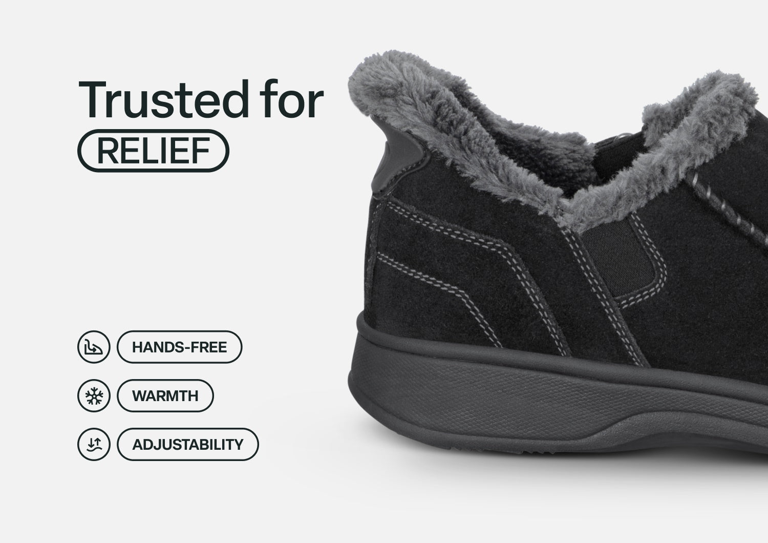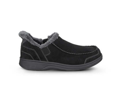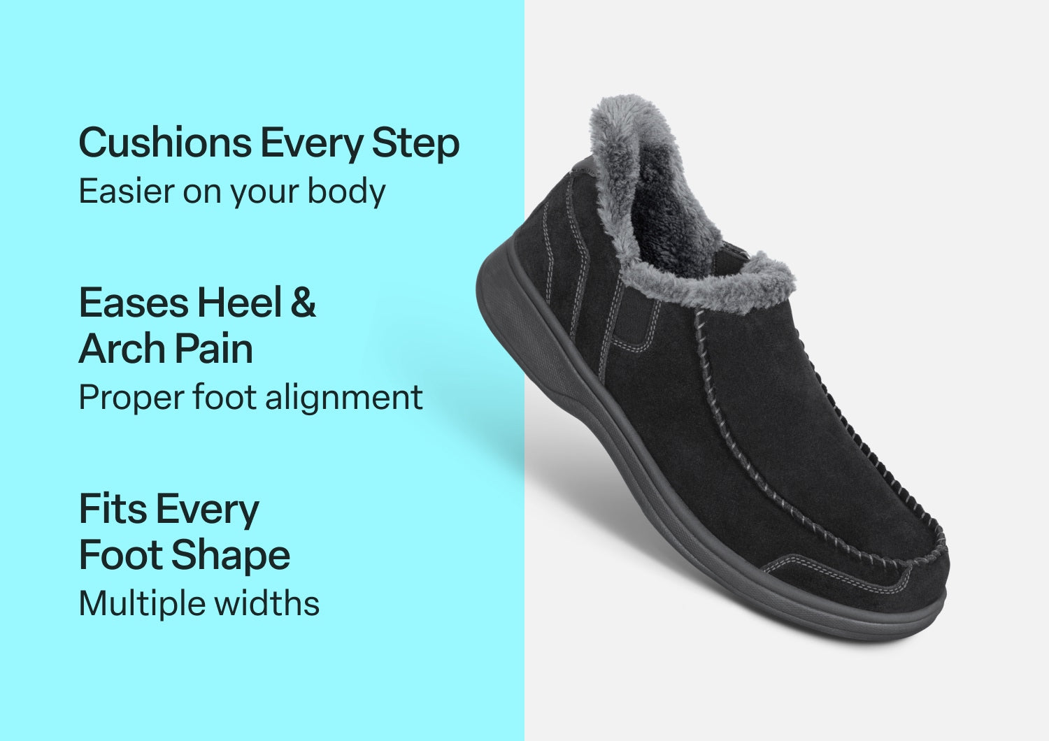 This tailored suede slipper-shoe offers full foot protection indoors and out. Put these on without bending down, thanks to our patented hands-free design. Lined completely in faux fur and featuring the supportive, easy-walking technology of the Ortho-Cushion™ System, Vito keeps your feet warm and well supported for more pain-free hours doing this and that, anywhere.