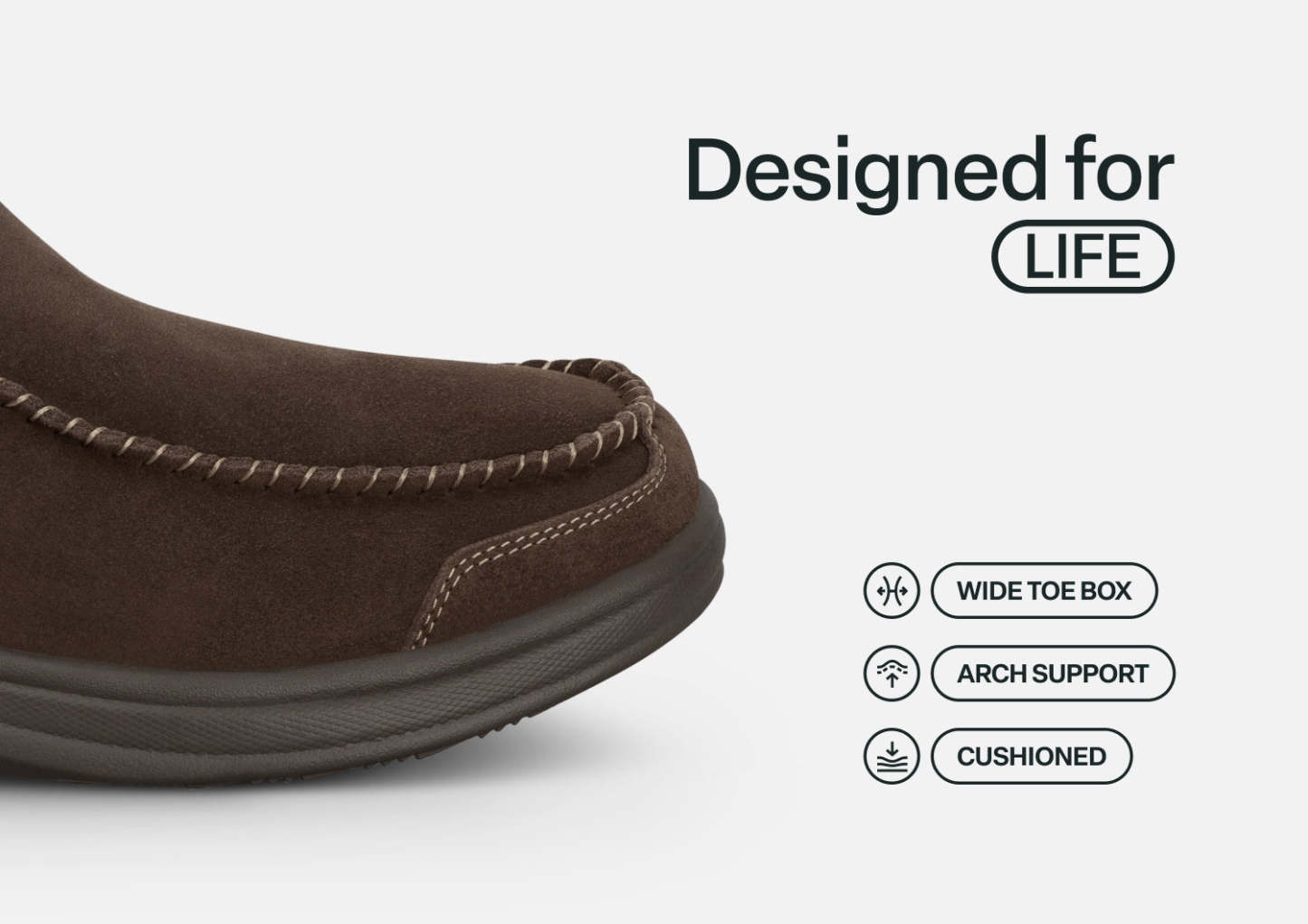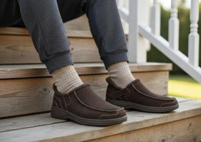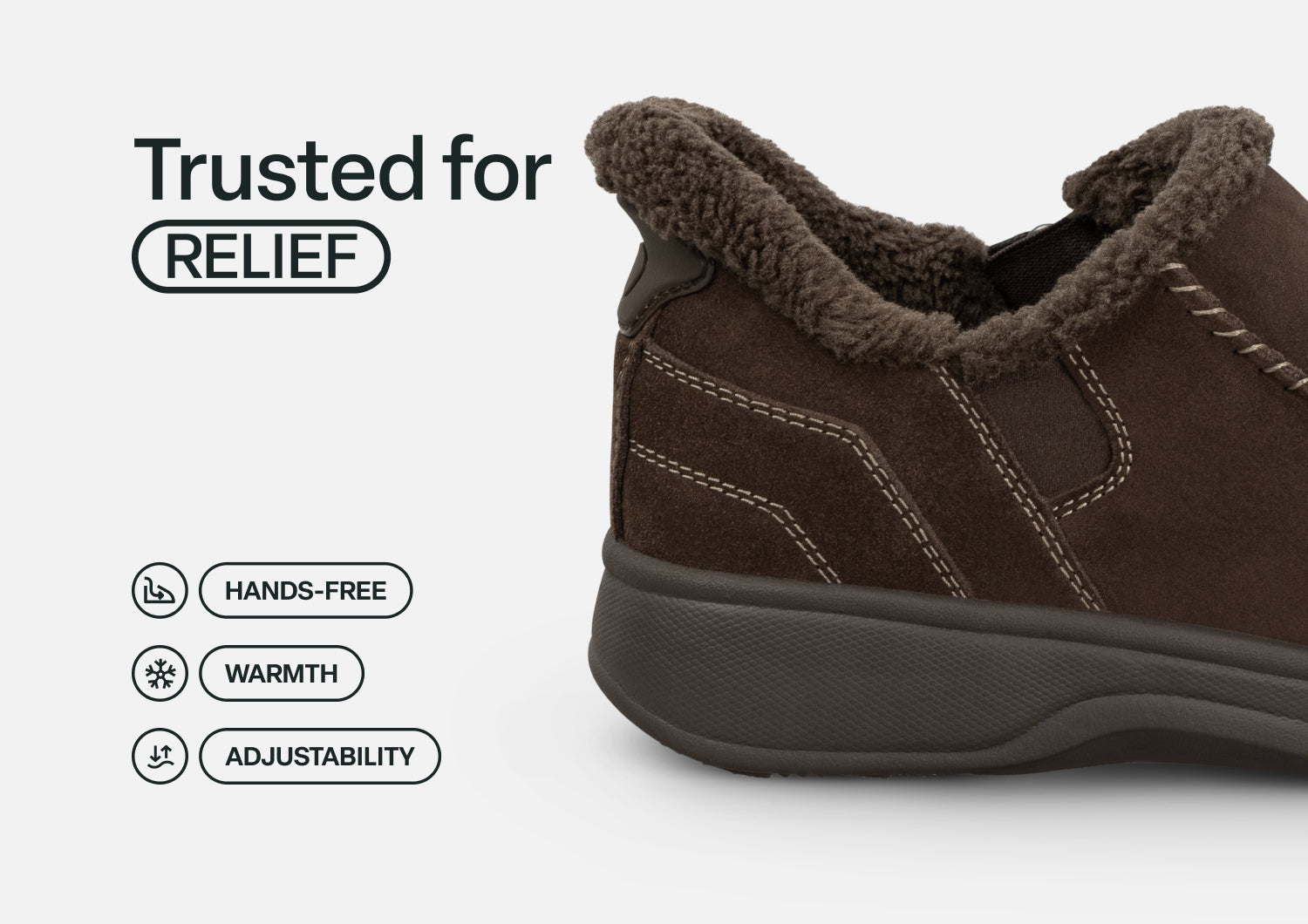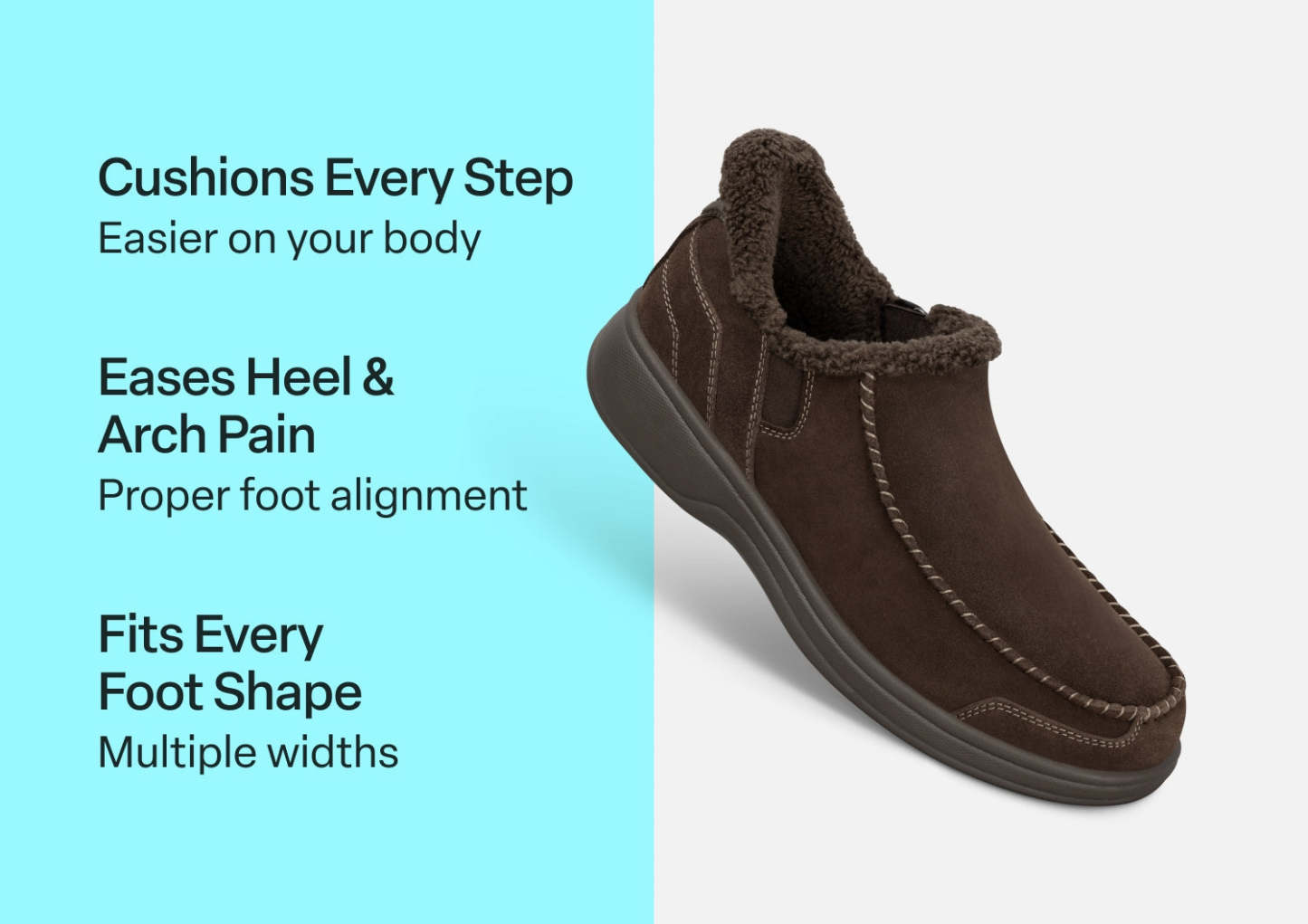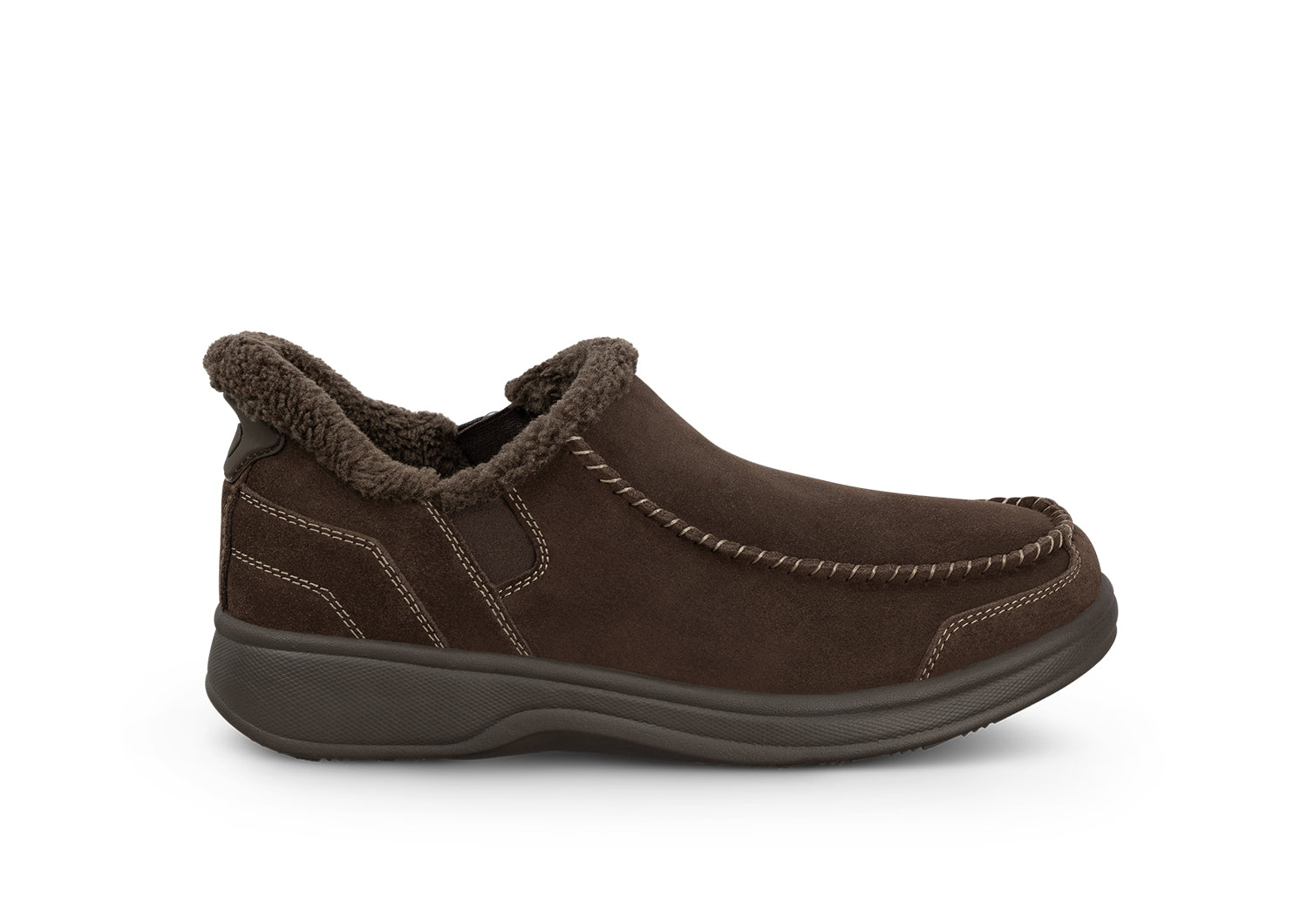 This tailored suede slipper-shoe offers full foot protection indoors and out. Put these on without bending down, thanks to our patented hands-free design. Lined completely in faux fur and featuring the supportive, easy-walking technology of the Ortho-Cushion™ System, Vito keeps your feet warm and well supported for more pain-free hours doing this and that, anywhere.